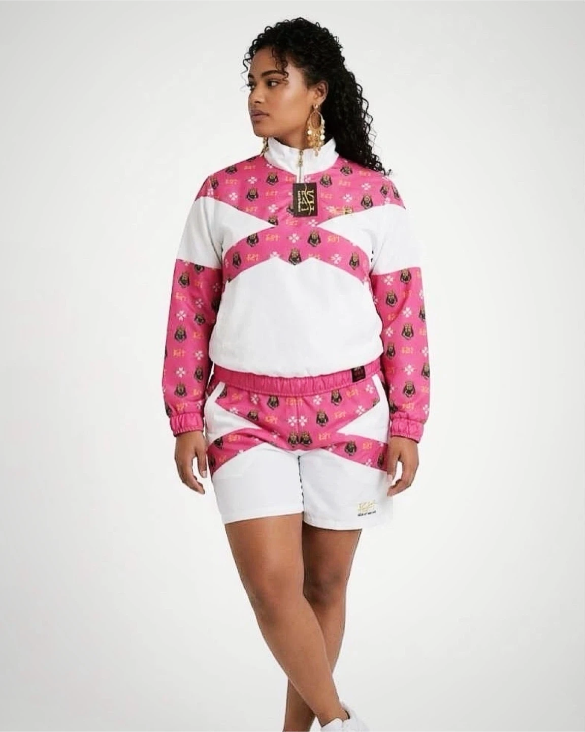 This is a two-piece track set featuring a jacket and matching shorts. The set has a white base with a vibrant pink geometric pattern. It's a comfy and stylish outfit for casual wear.