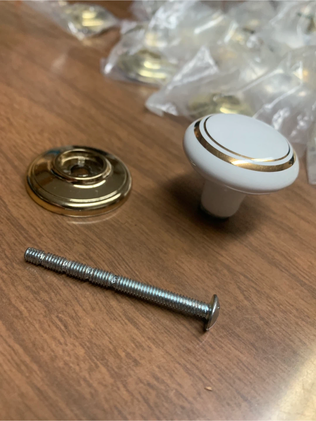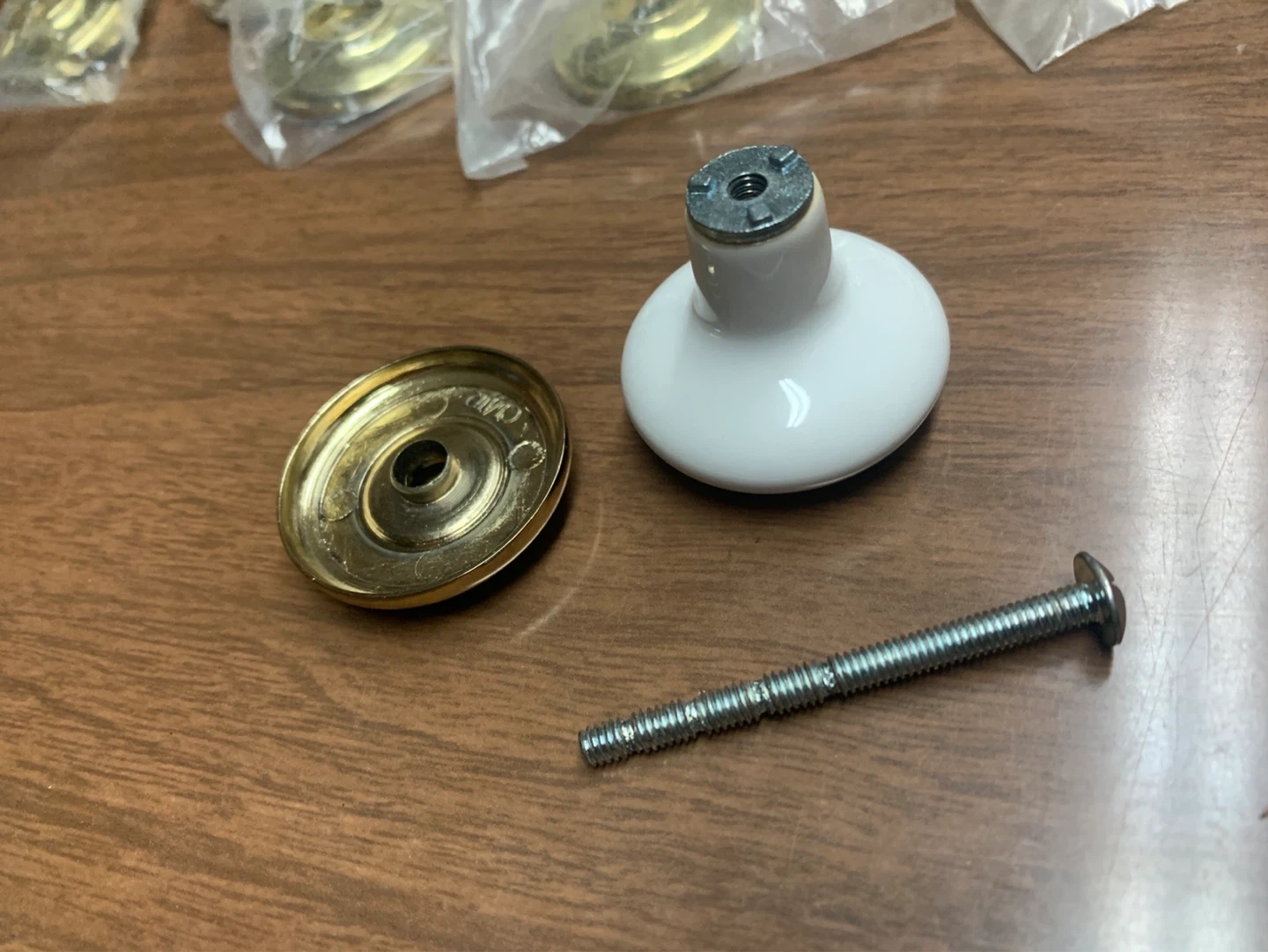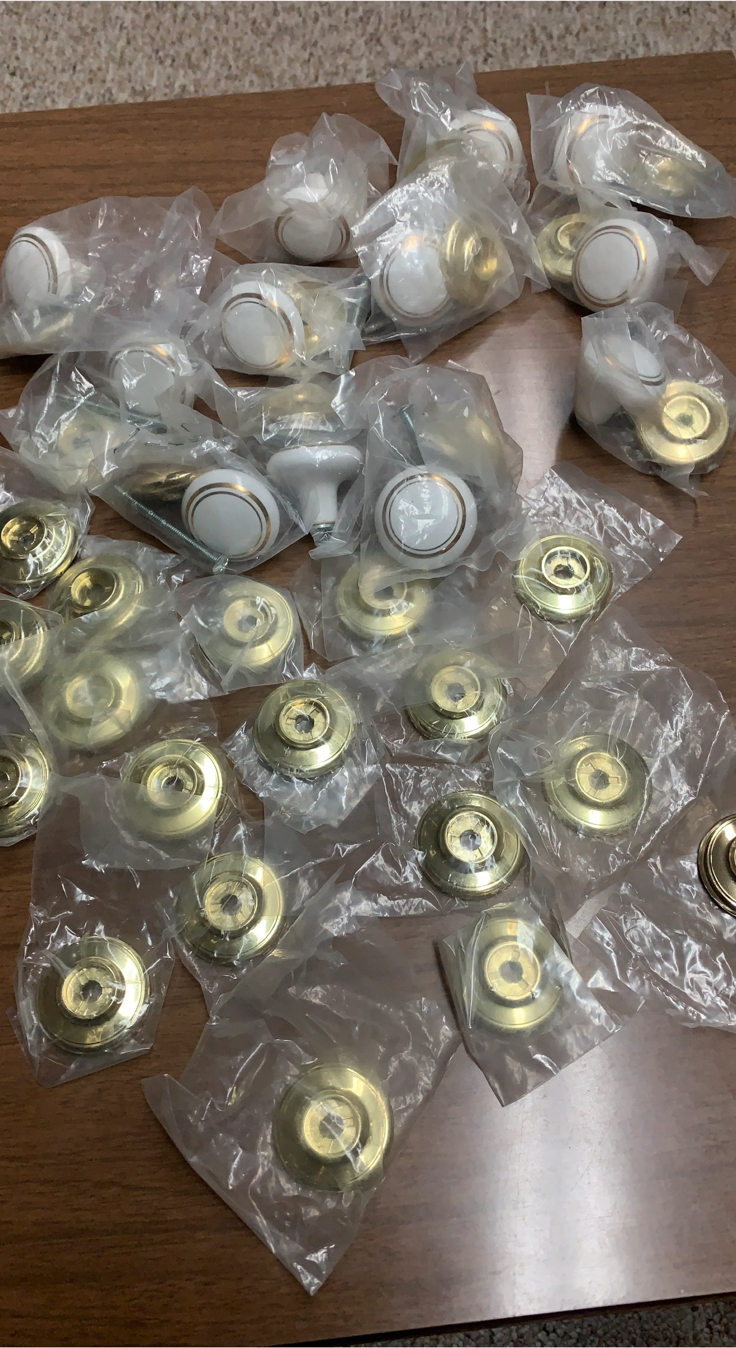 Included are 19 brass Knob bases that can be used for preexisting knobs on your cabinets.
