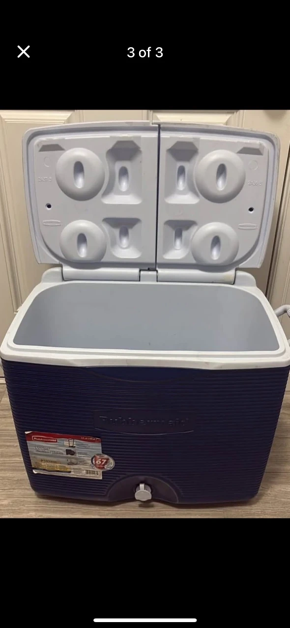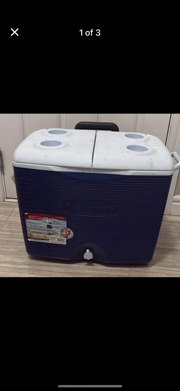 Selling a Rubbermaid cooler in great condition! It's a 45 quart (42.6 L) cooler with a retractable handle and rugged wheels. It also has a split lid and Microban protection to protect against bacteria