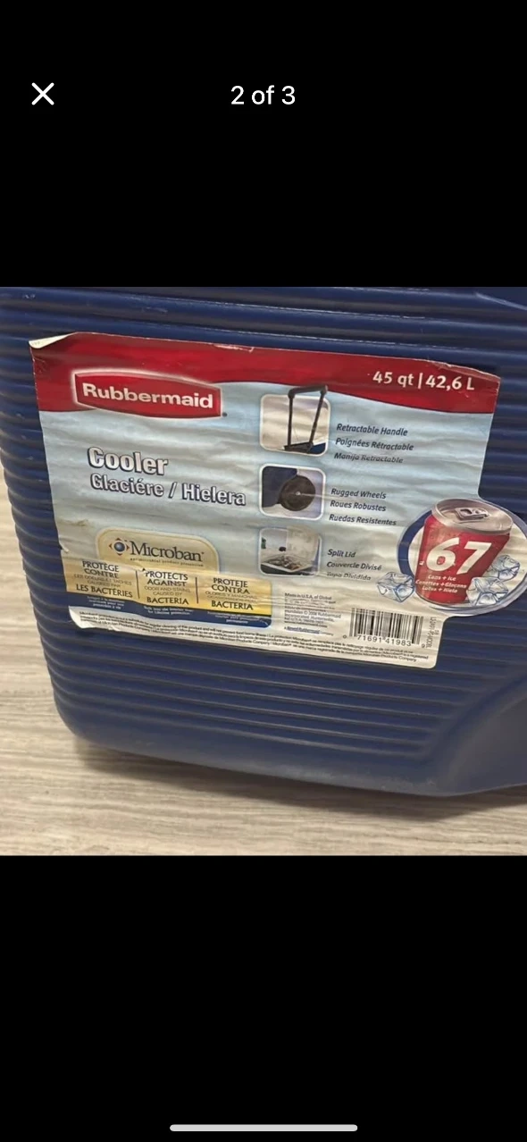 Selling a Rubbermaid cooler in great condition! It's a 45 quart (42.6 L) cooler with a retractable handle and rugged wheels. It also has a split lid and Microban protection to protect against bacteria