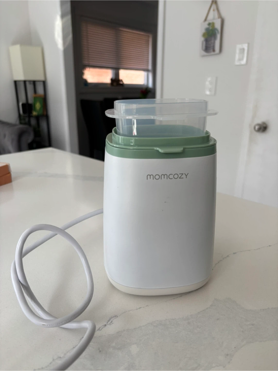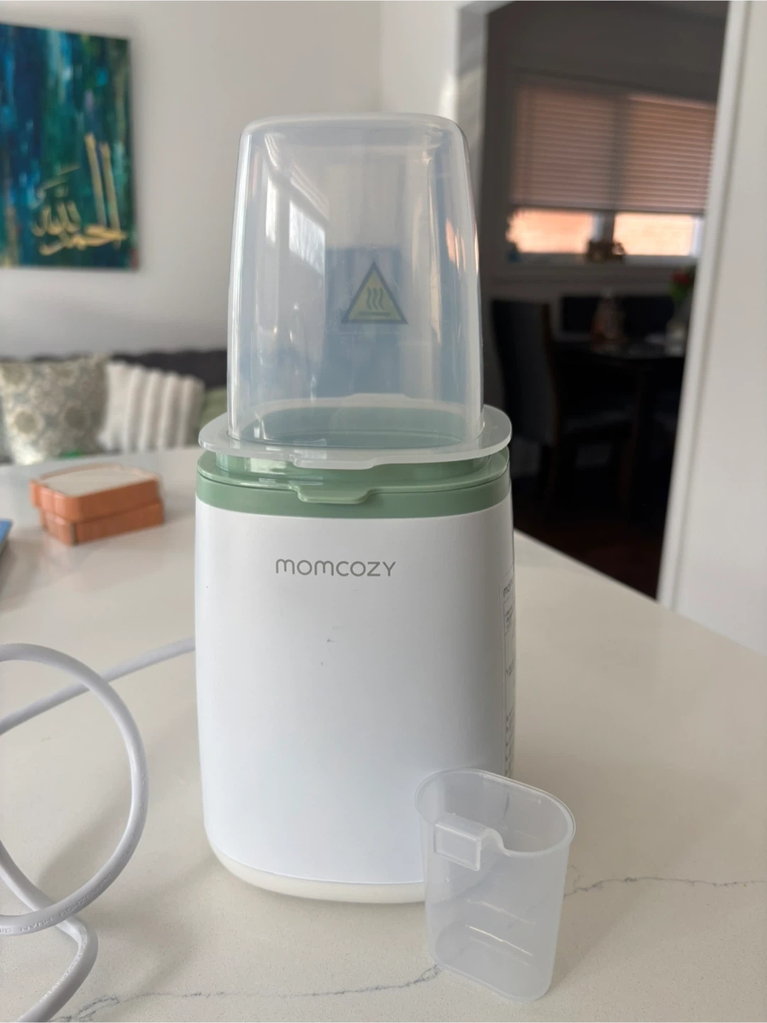 This Momcozy smart baby bottle warmer and sterilizer quickly warms milk or formula. It has a steam sterilization function to keep bottles clean. The unit includes a small measuring cup and a basket insert. BRAND NEW