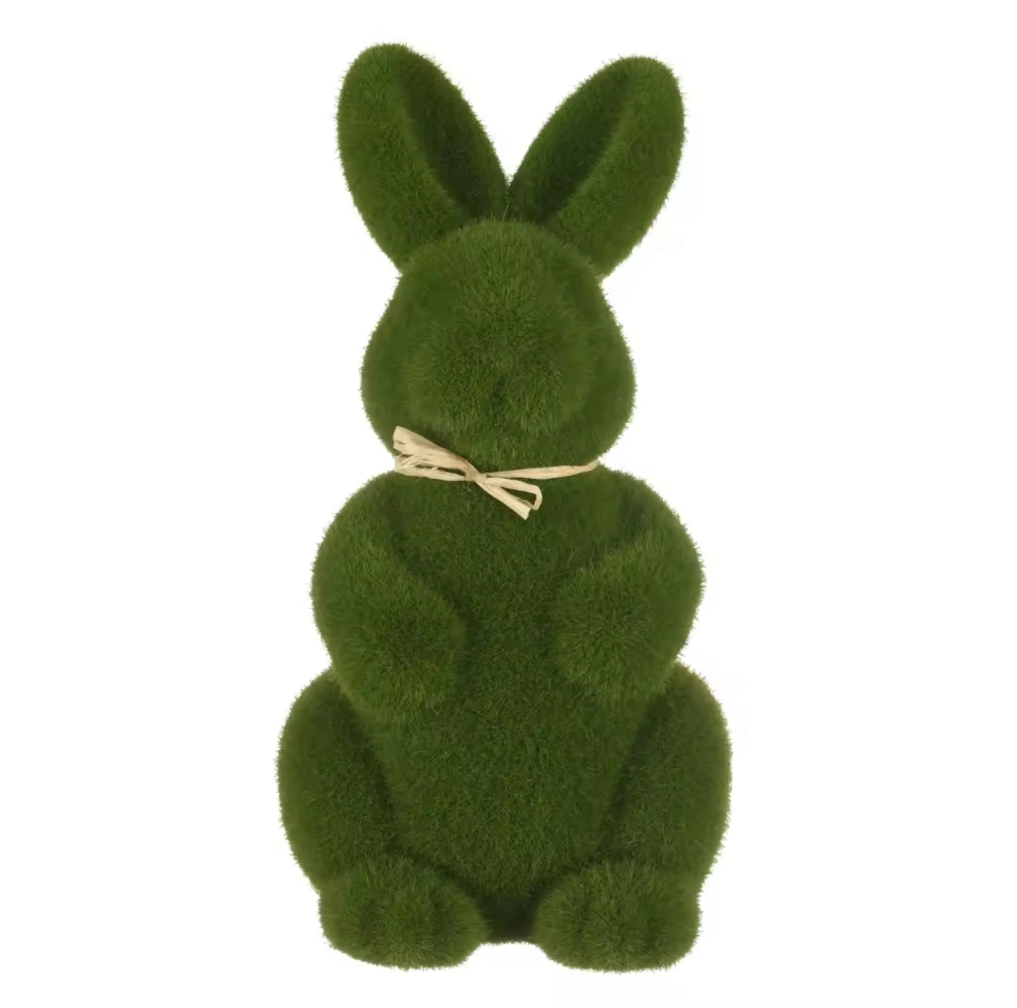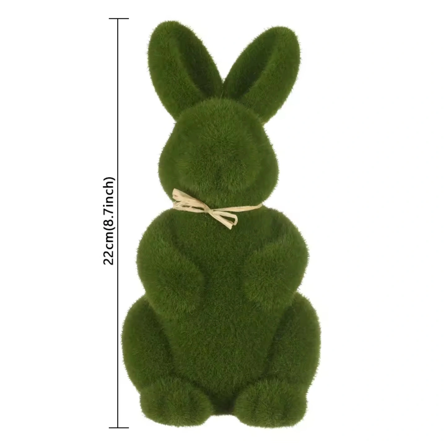 Cute green bunny decoration. Perfect for Easter or spring decor. Measures 22cm (8.7 inches) tall. Features a simple raffia bow, which can be removed.
