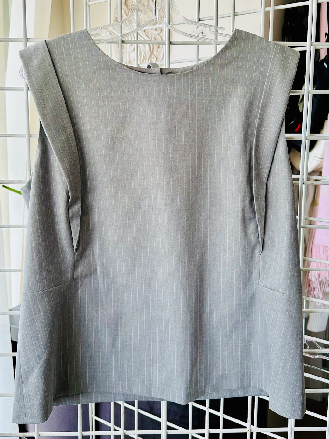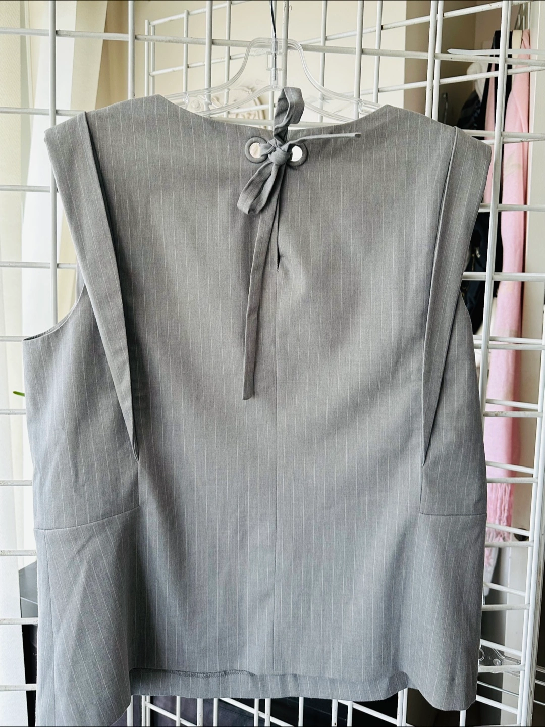 Grey pinstripe sleeveless top. Features a round neckline and a tie at the back. Relaxed fit. Size L/G.