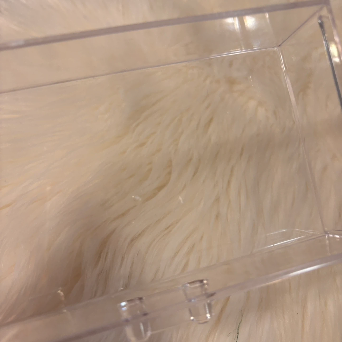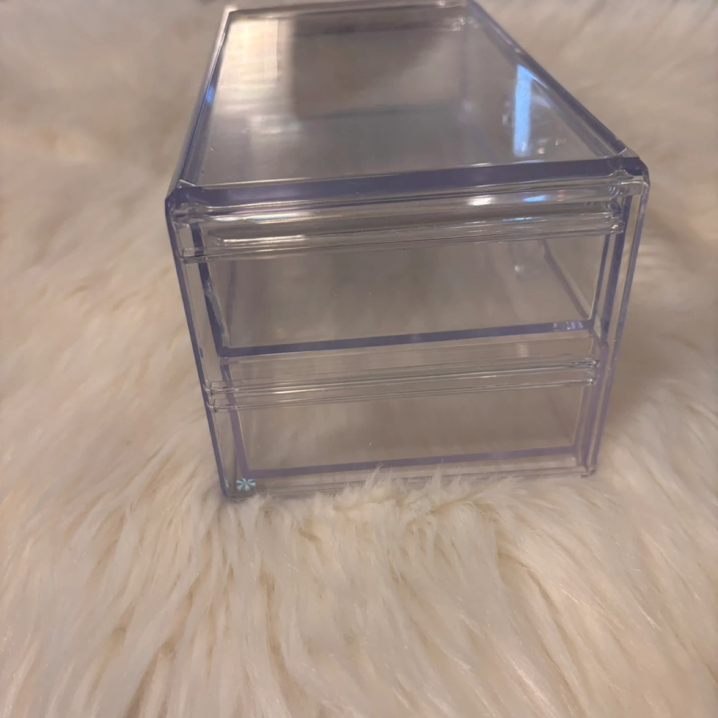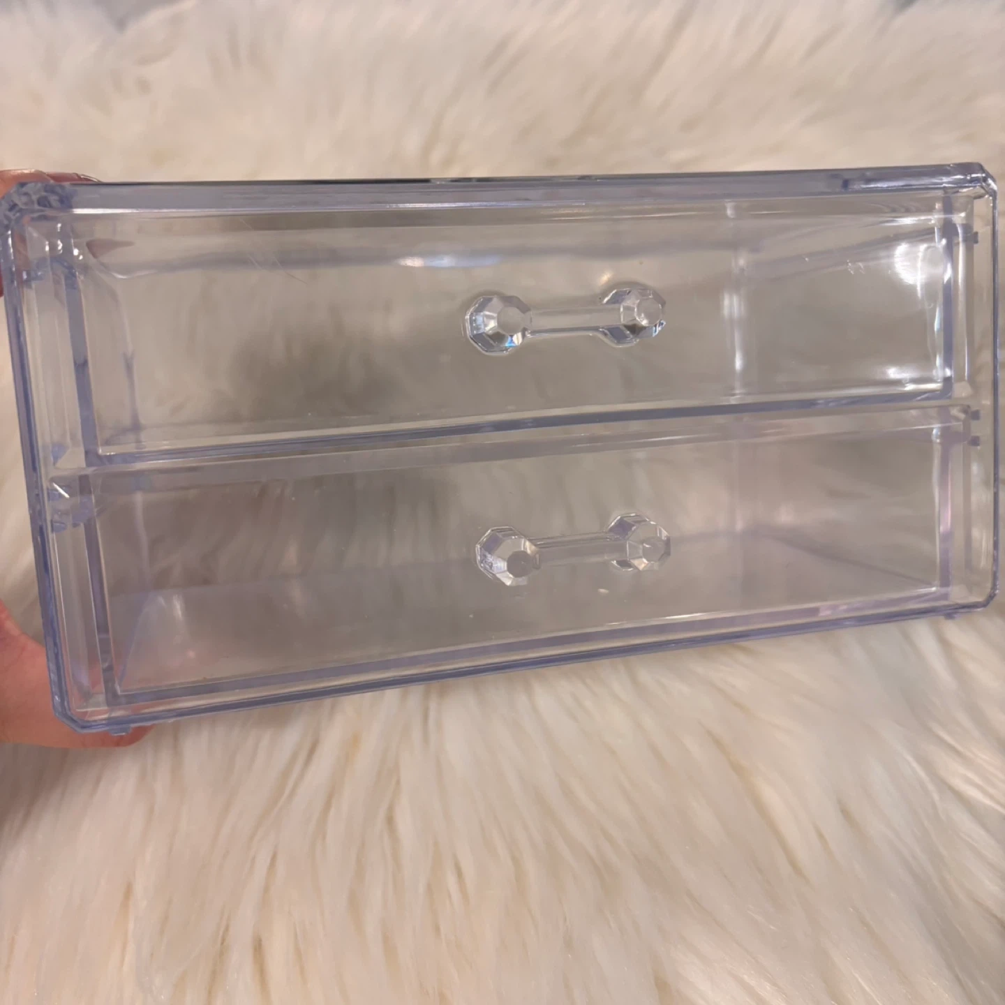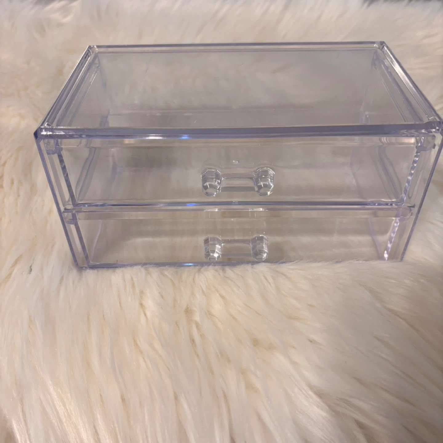 This is a clear acrylic organizer with two drawers. It's great for storing small makeup items or accessories. The clear design makes it easy to see what's inside!