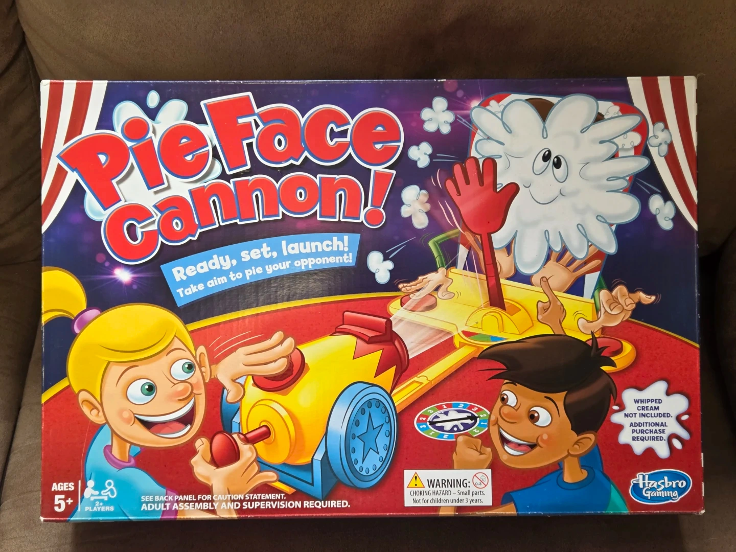 Get ready for some messy fun with Pie Face Cannon! This exciting board game is for ages 5 and up. It's designed for quick setup and even quicker laughs as players try to avoid getting pied. Requires whipped cream or wet sponge (not included).