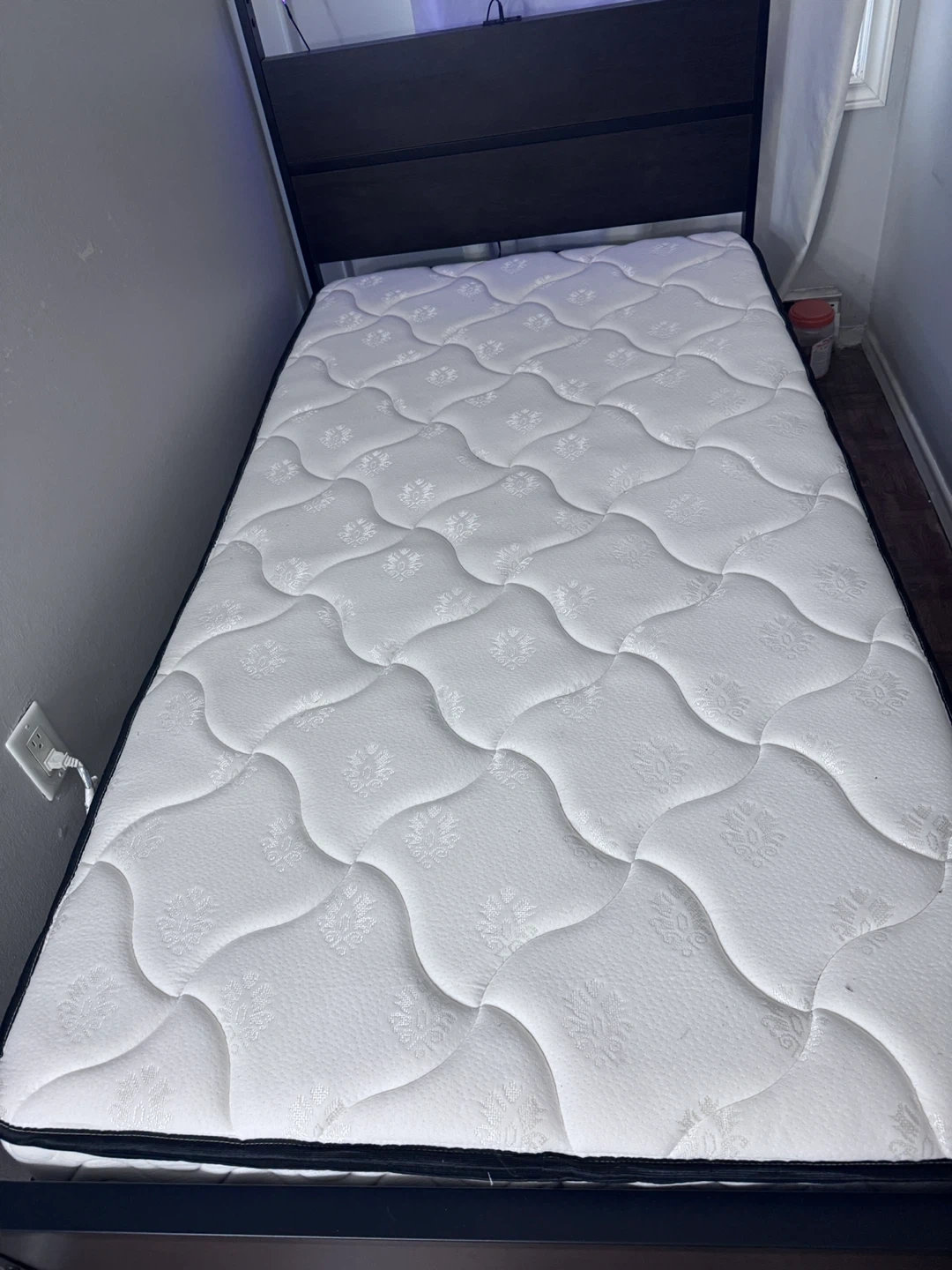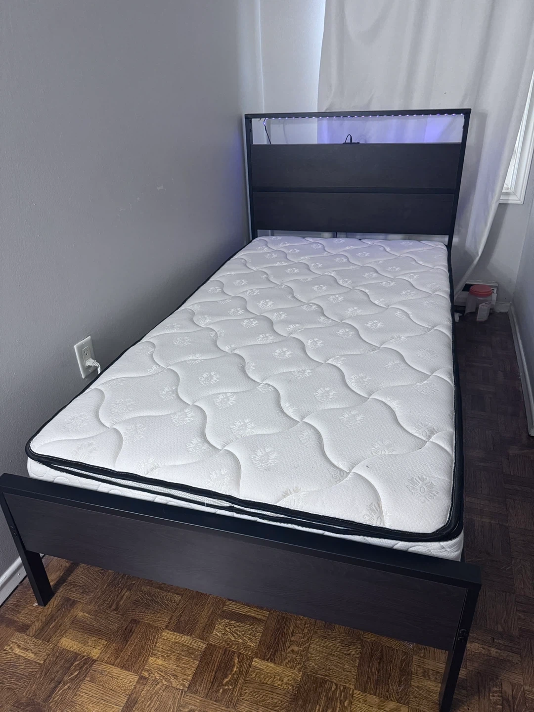 Selling a twin bed frame that comes with a headboard! It also has built-in USB ports, which is super handy for charging your devices overnight. Great for a small space!