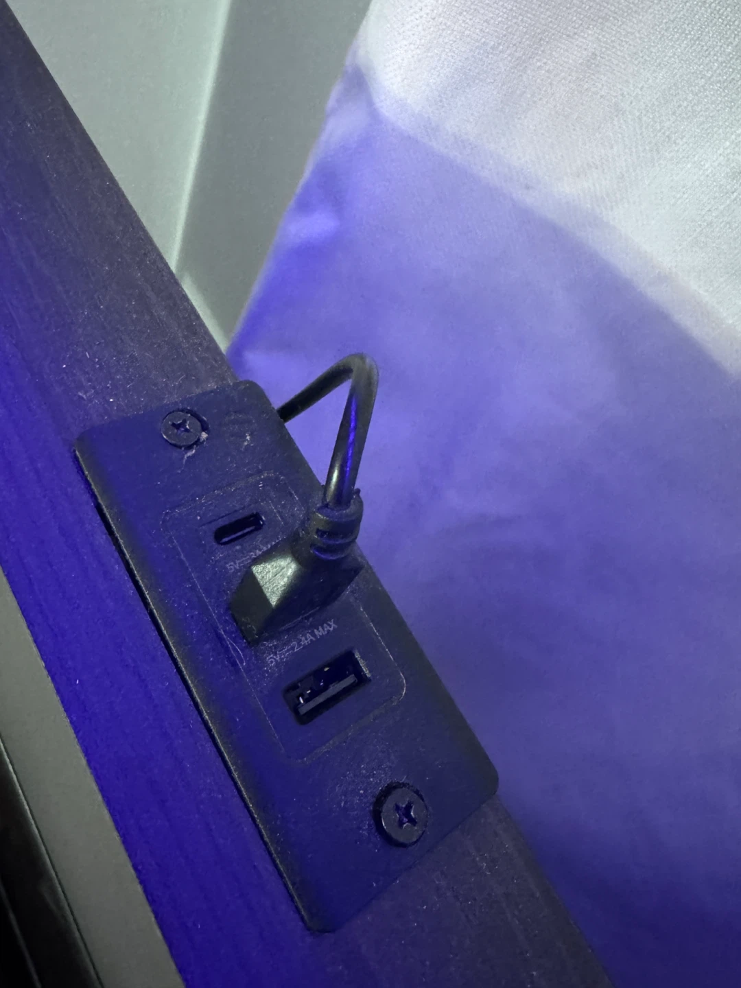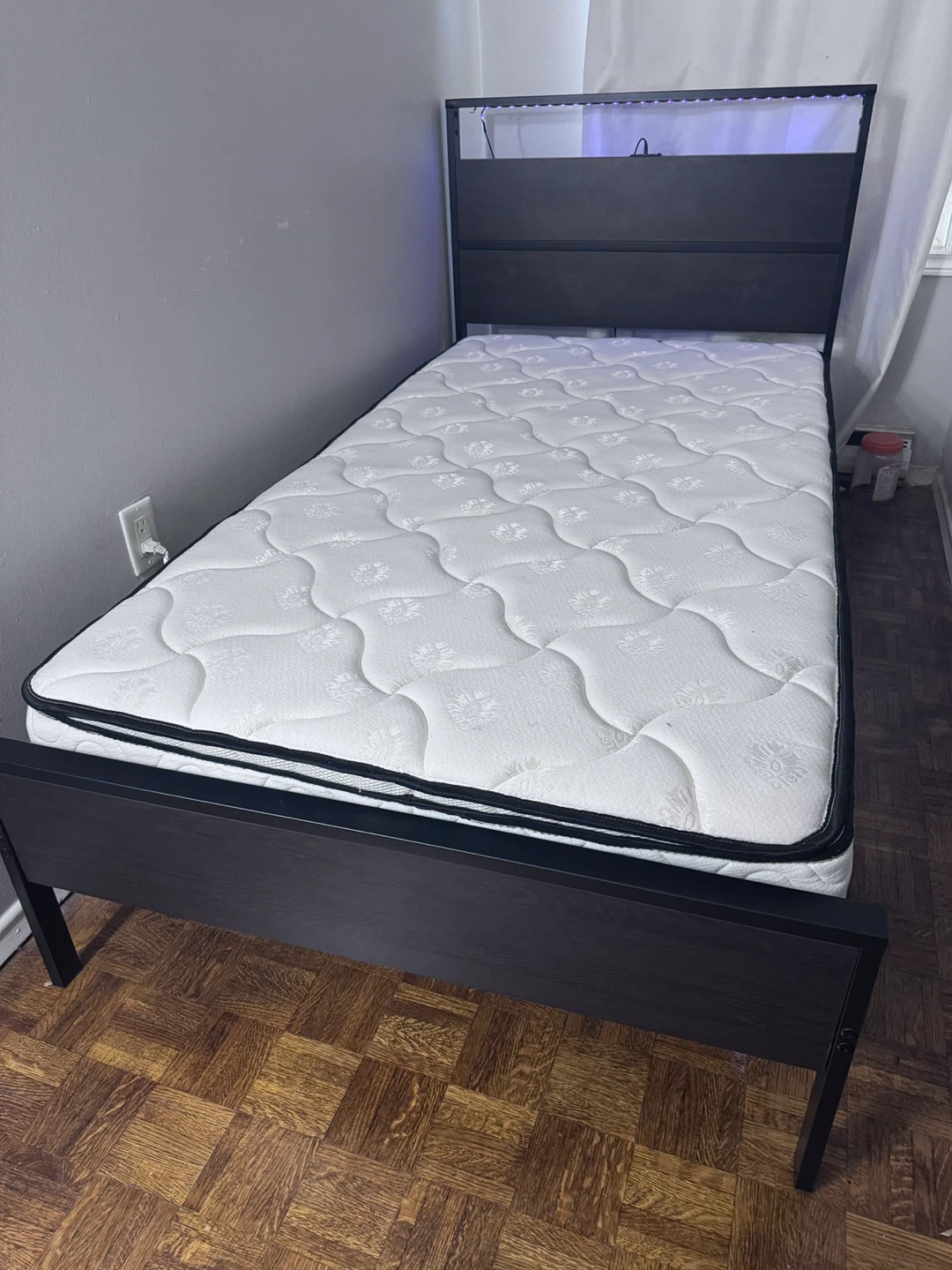 Selling a twin bed frame that comes with a headboard! It also has built-in USB ports, which is super handy for charging your devices overnight. Great for a small space!