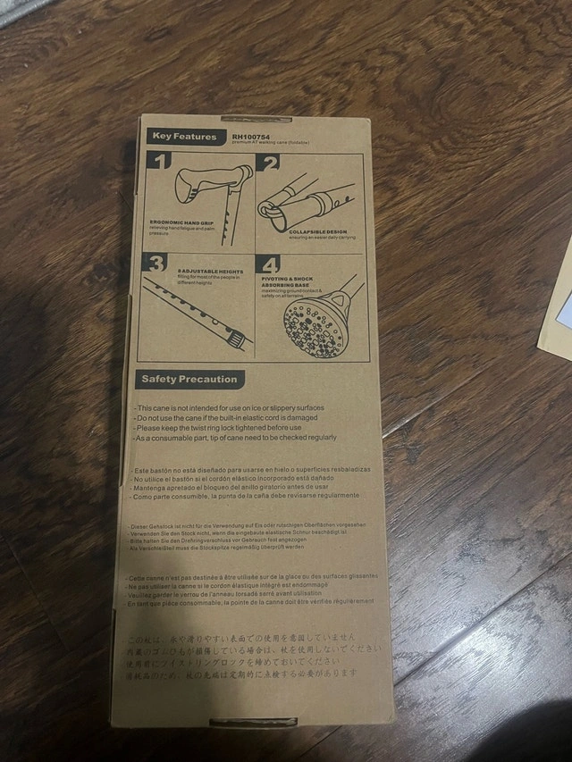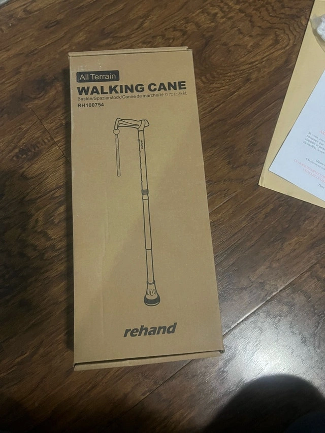 Explore any terrain with this Rehand all-terrain walking cane, designed for stability and support on various surfaces, ensuring safety and comfort for every step of your adventure. This walking cane is in new condition. Key Features: * All-Terrain Design * Stout Hand Grip * Collapsible Design * Adjustable Heights * Pivoting. Cash accepted.
