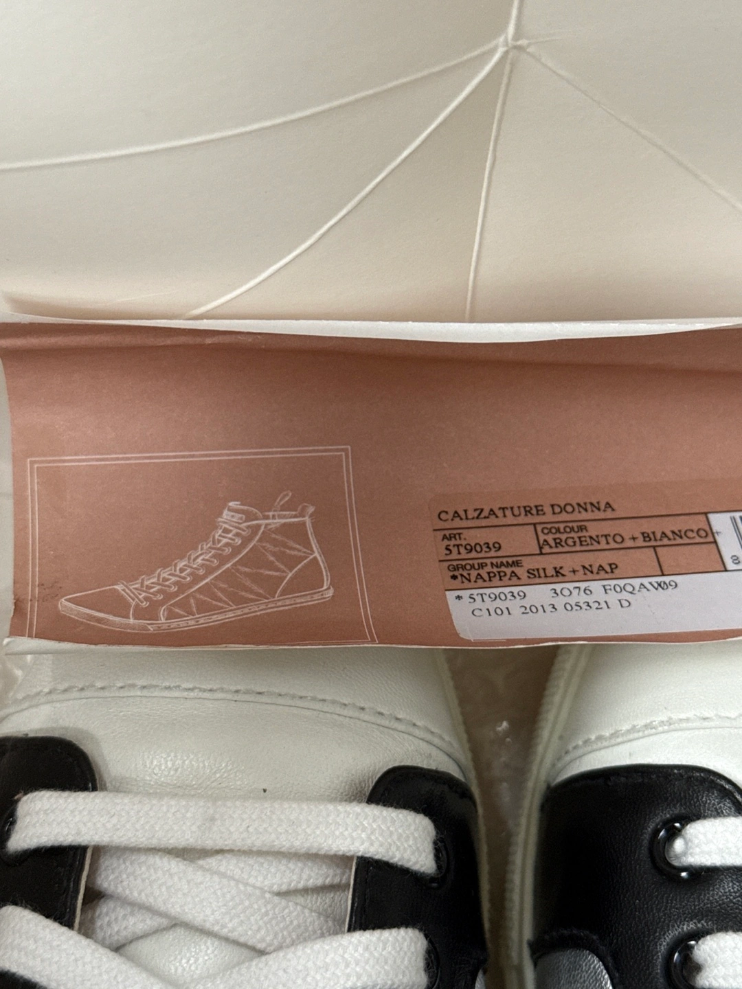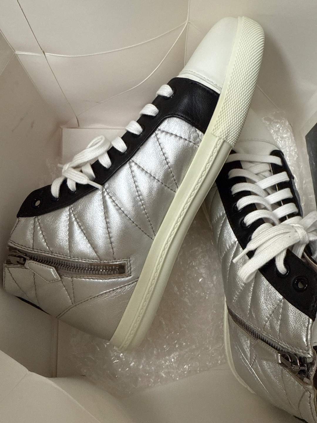 Women's high-top sneakers. Silver quilted leather upper. Black leather accents. White rubber sole. Zip closure. Authentic, Come in the box tag only. No dustbag or box anymore.