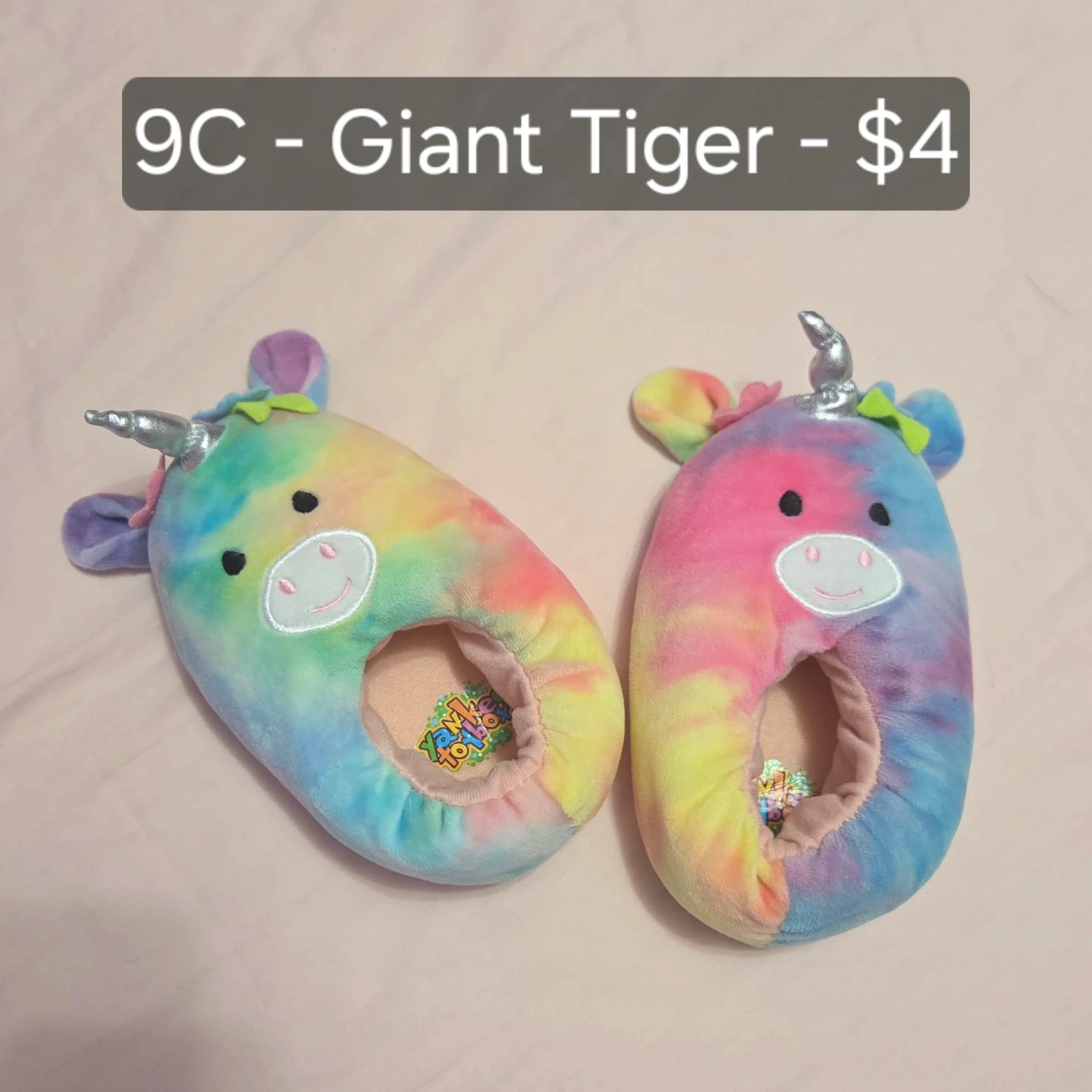 Worn about 4 times. Excellent condition. These fun unicorn slippers have a tie-dye rainbow design. They feature a plush exterior and a soft interior. Perfect for keeping little feet cozy!
