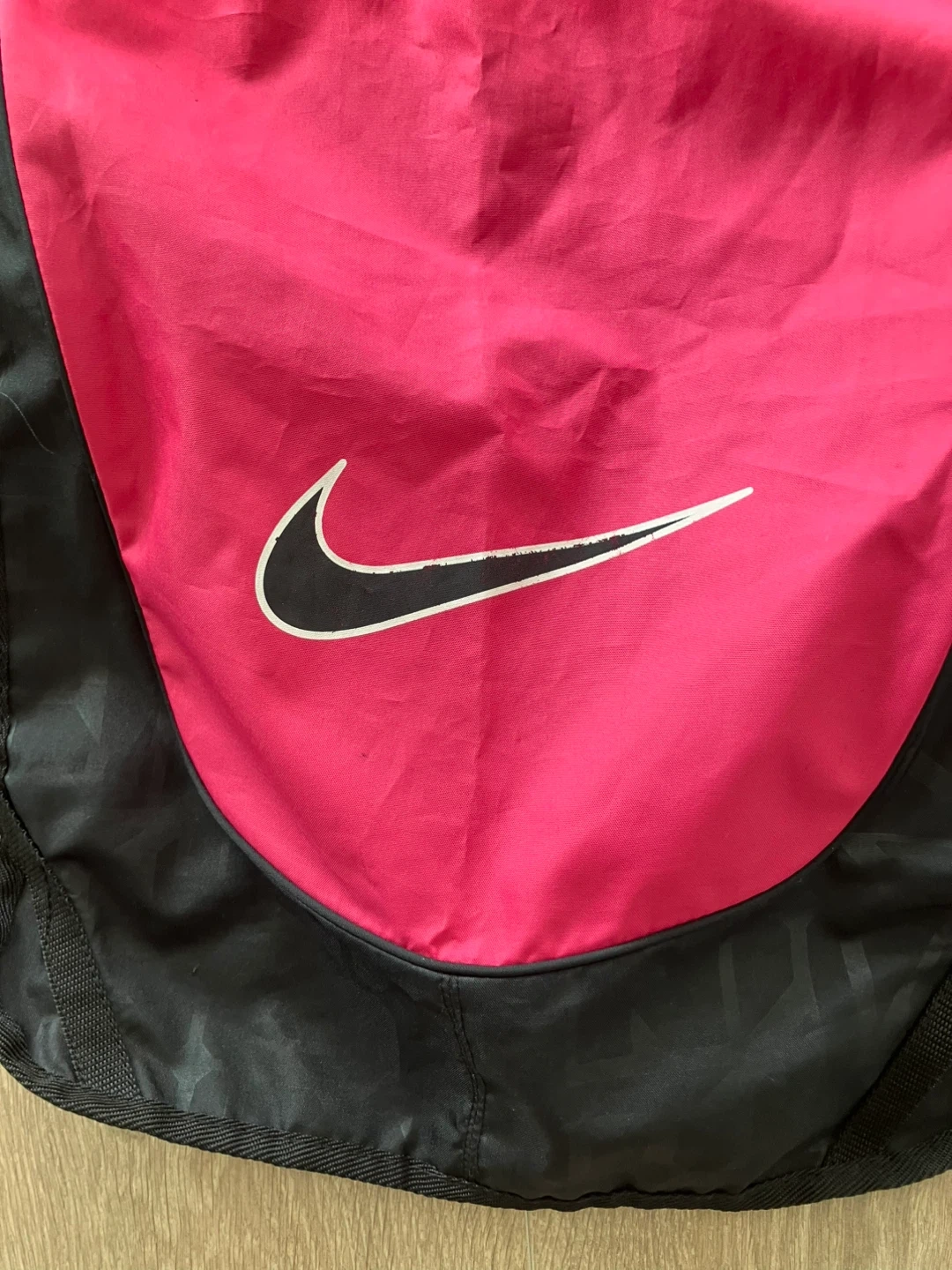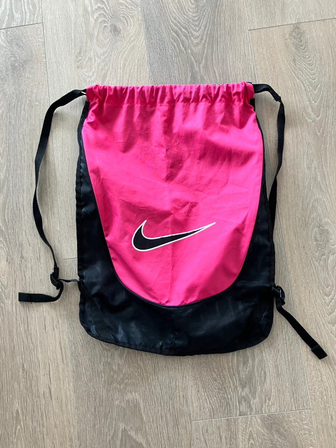 This Nike drawstring bag is great for gym or everyday use. It features the iconic Nike swoosh logo on a bright pink front panel, with a black lower section. The bag has adjustable shoulder straps that also serve as a drawstring closure.