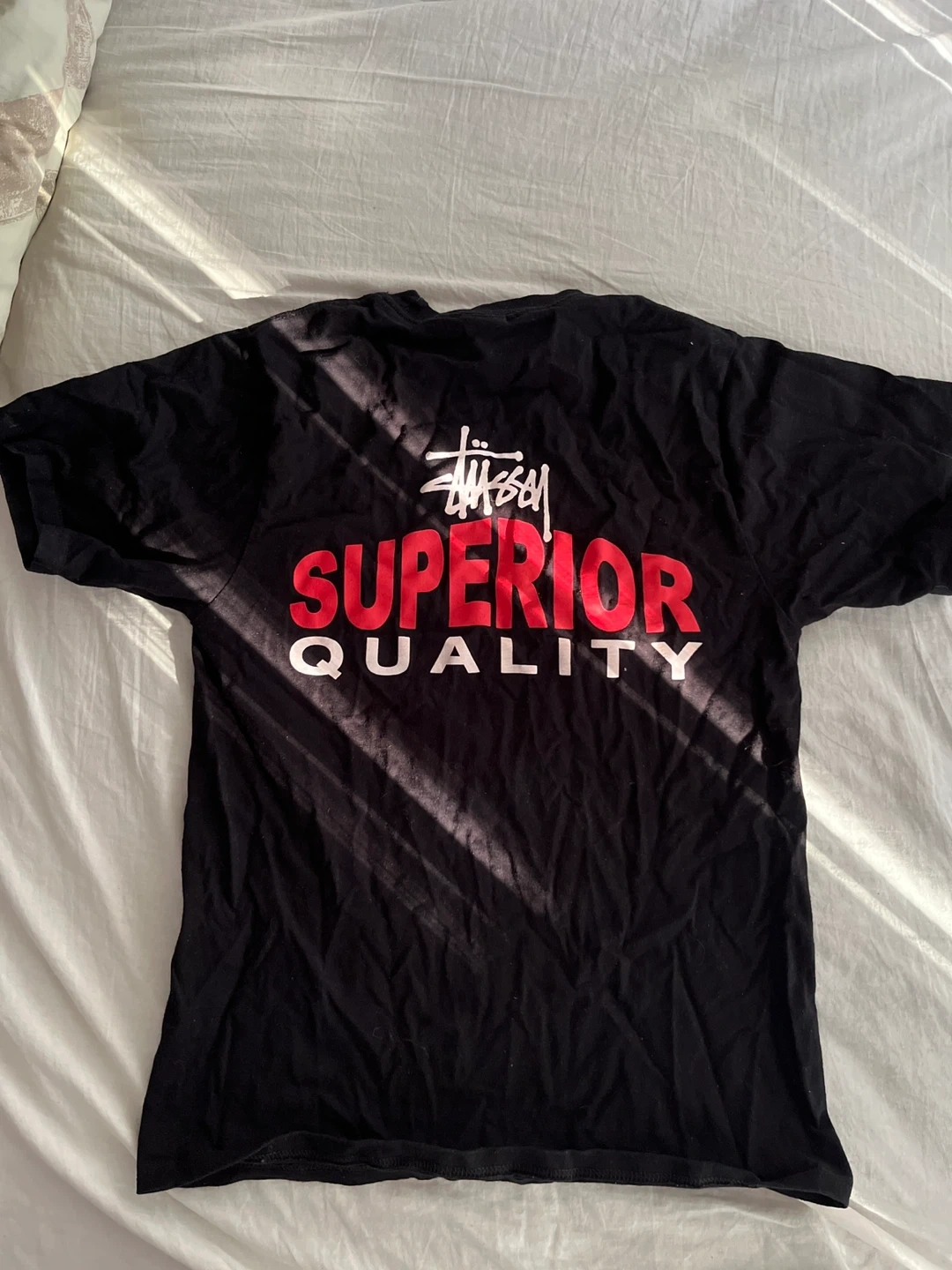 Black Stüssy t-shirt with 'Superior Quality' graphic. Made in Honduras. Size S.