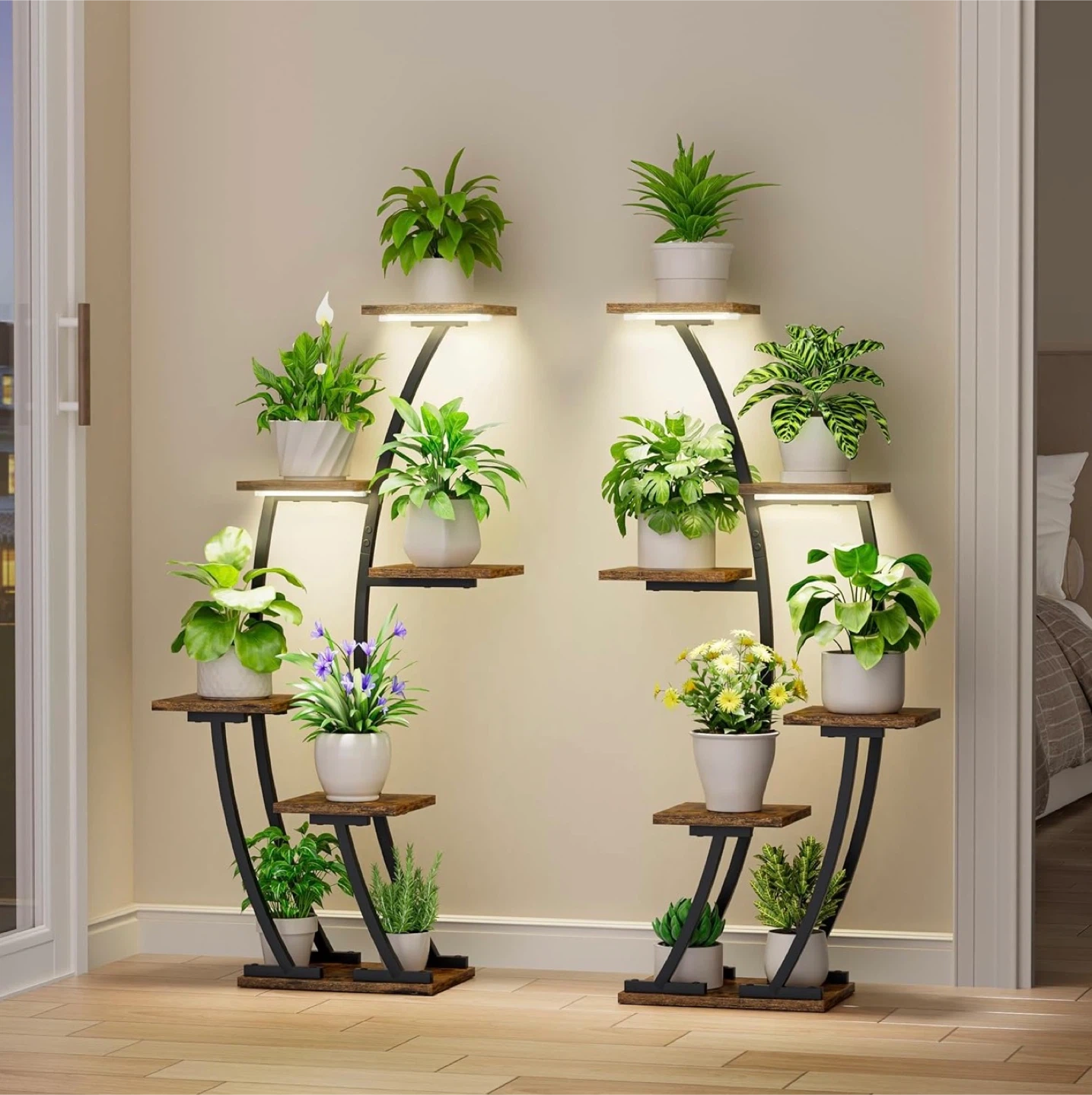 This is a 2-pack set of indoor plant stands. Each stand features a curved metal frame with wood-look shelves. Includes LED grow lights for your plants. Brand new in the box
