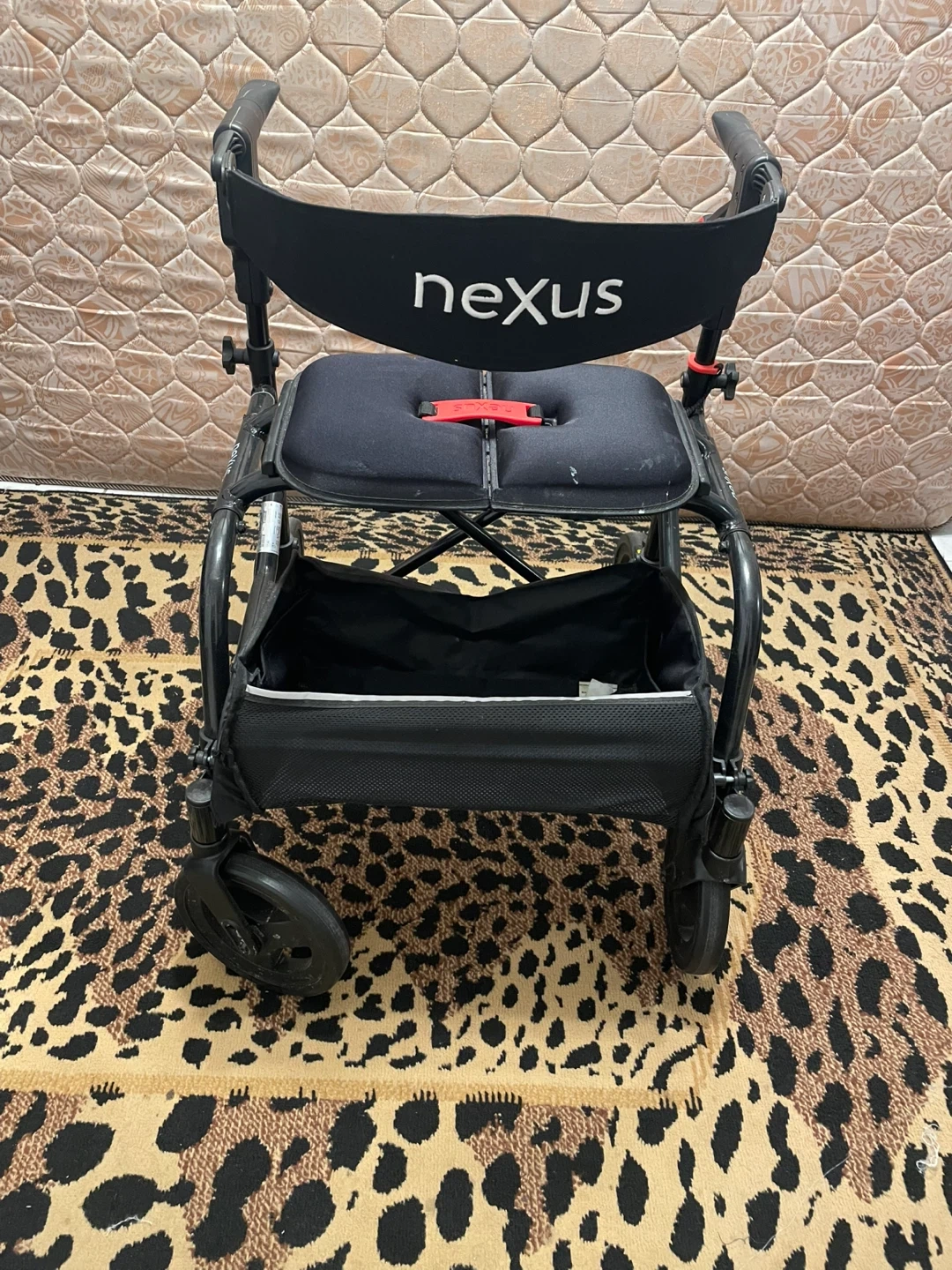 This black Nexus walker features a seat and a storage bag. It's designed for mobility assistance. Adjustable handles ensure a comfortable grip for users.