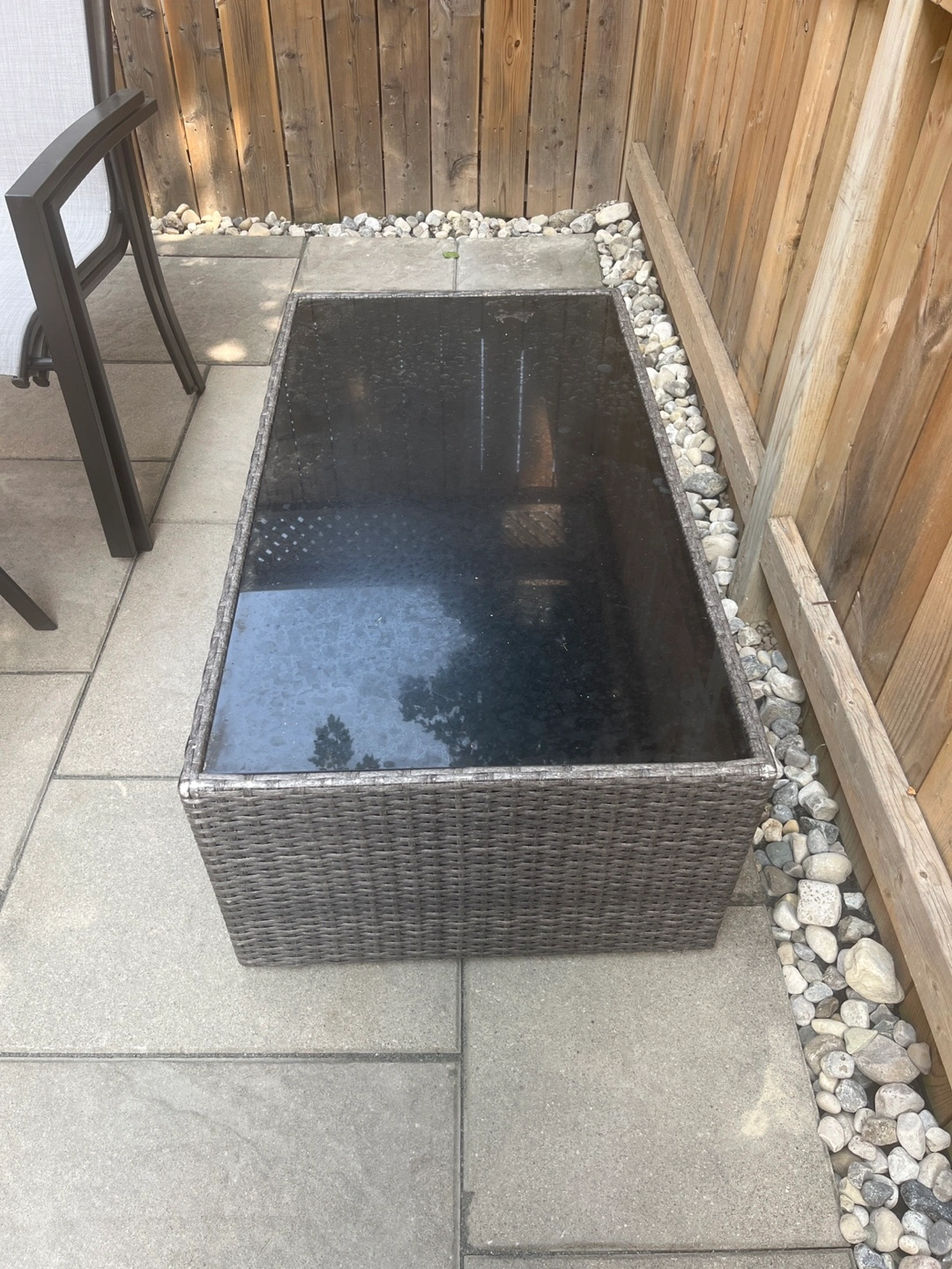 Selling a wicker patio coffee table with a glass top. It's a great addition to any outdoor seating area. The wicker gives it a nice, natural look, and the glass top is easy to clean. Perfect for enjoying your morning coffee or evening drinks on the patio!