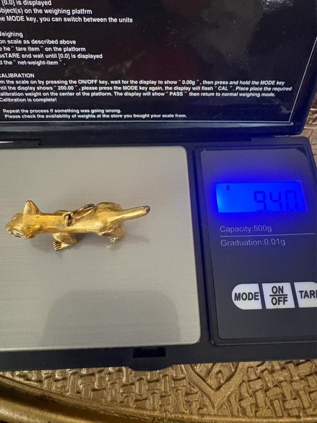 This is a decorative gold figurine of an animal. It weighs 9.4g on the scale. It's a unique piece that would make a great addition to a collection. It has 24 stamped underneath - from my parents long closed antiques shop but found amongst my fathers small box of gold and silver items