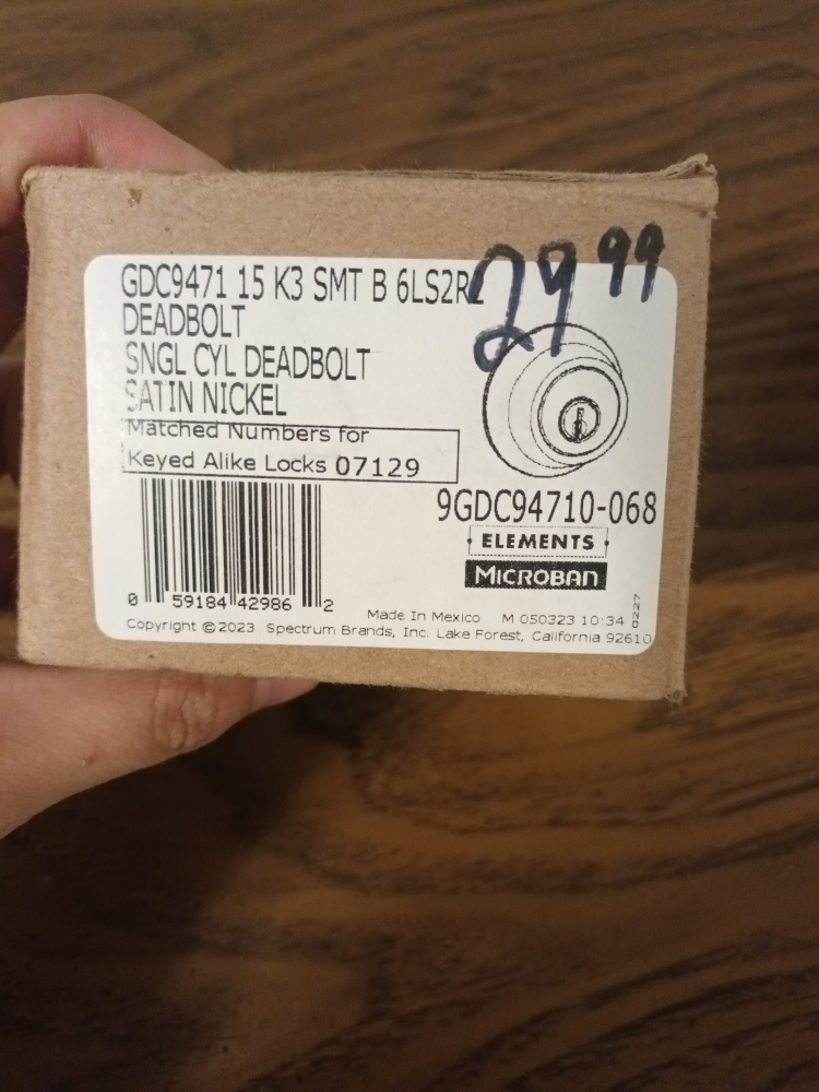 New in box Weiser deadbolt. Single cylinder deadbolt. Satin nickel finish. Keyed alike. Model number GDC9471.