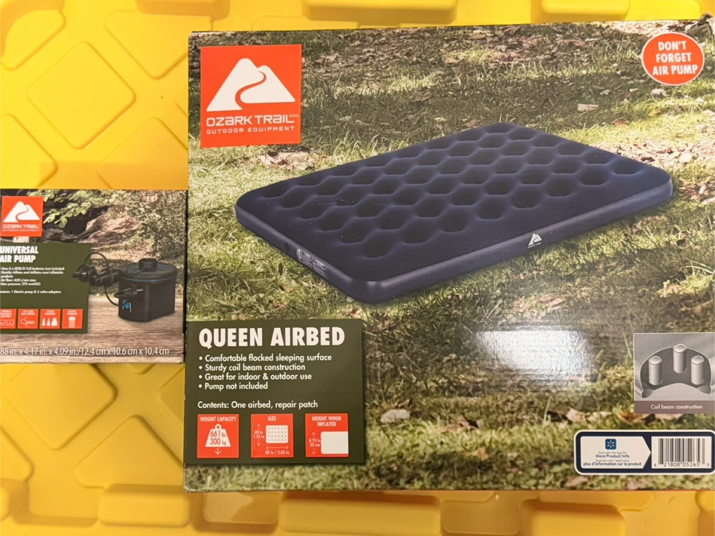 This Ozark Trail Queen Airbed has a comfortable flocked sleeping surface and sturdy coil beam construction. It's great for indoor and outdoor use. Contents include one airbed and a repair patch. Pump included with batteries.