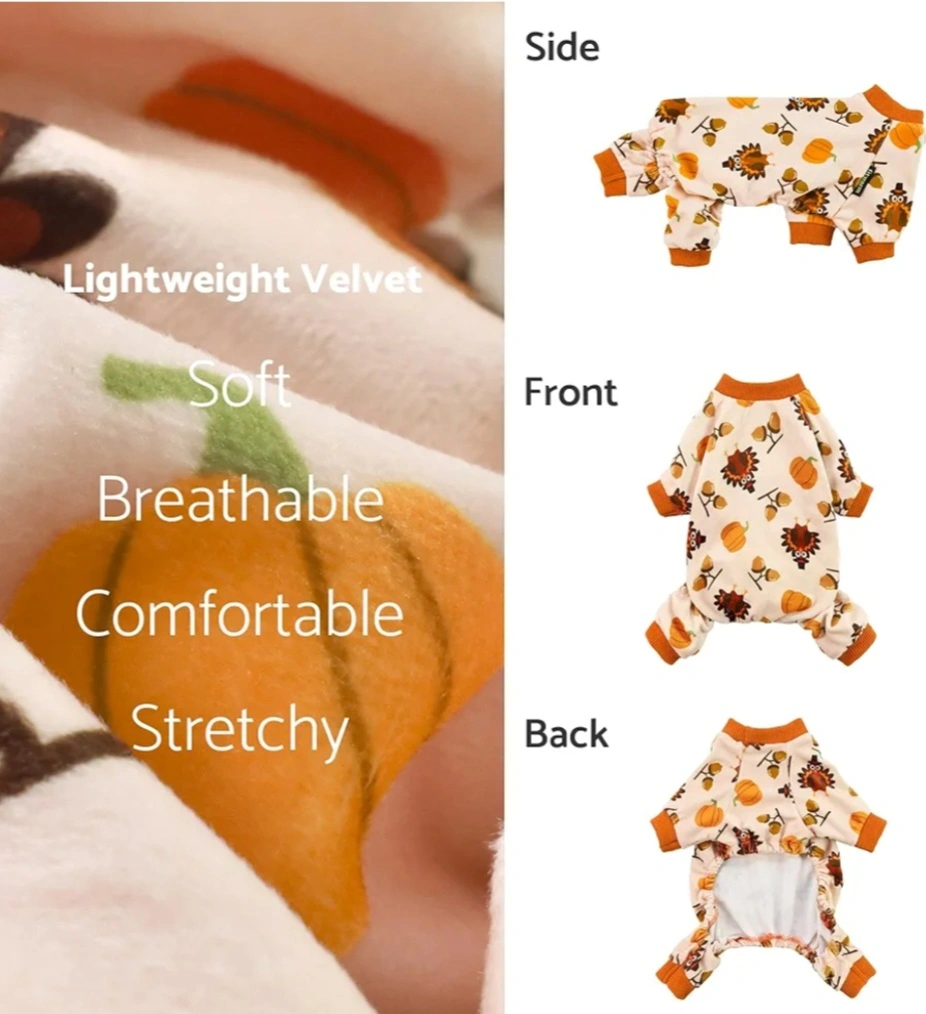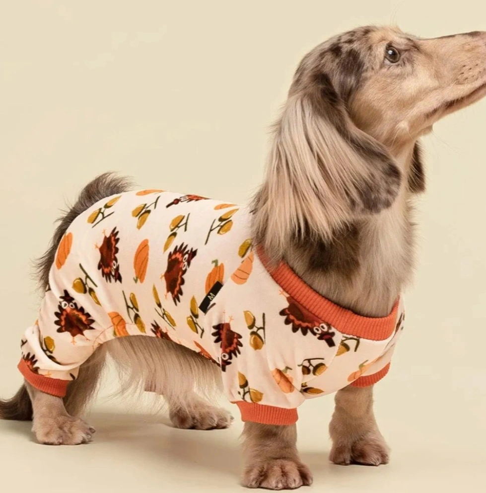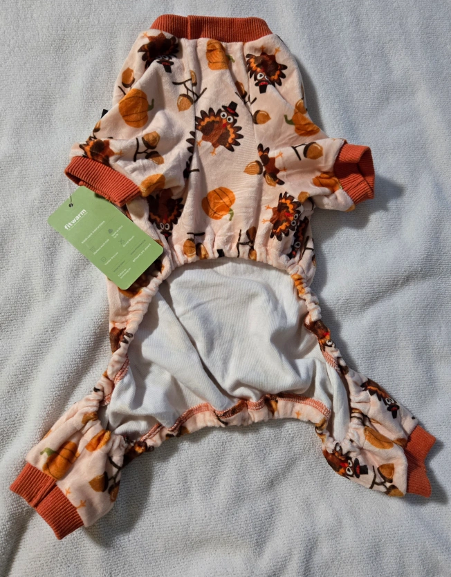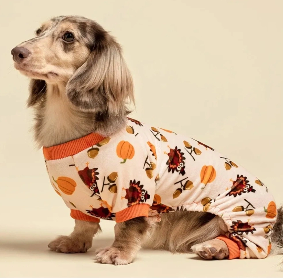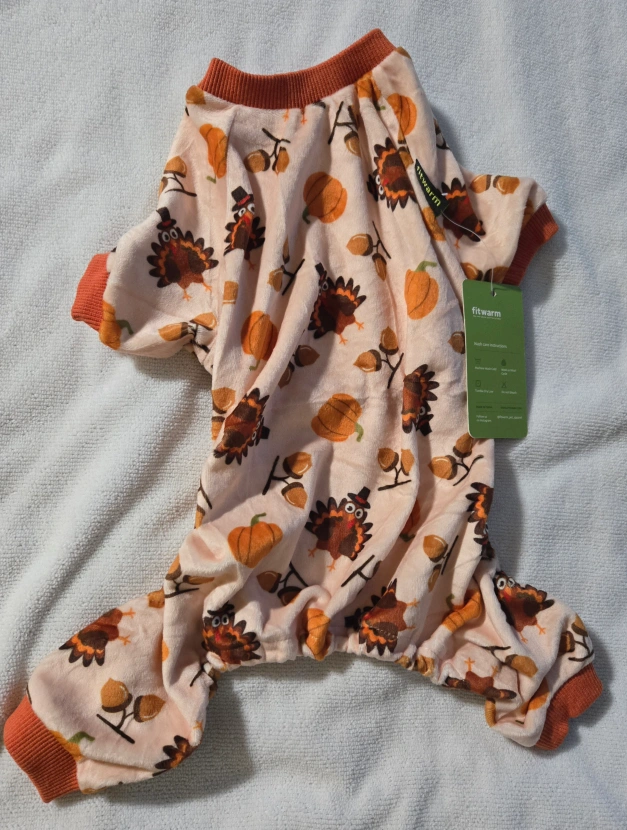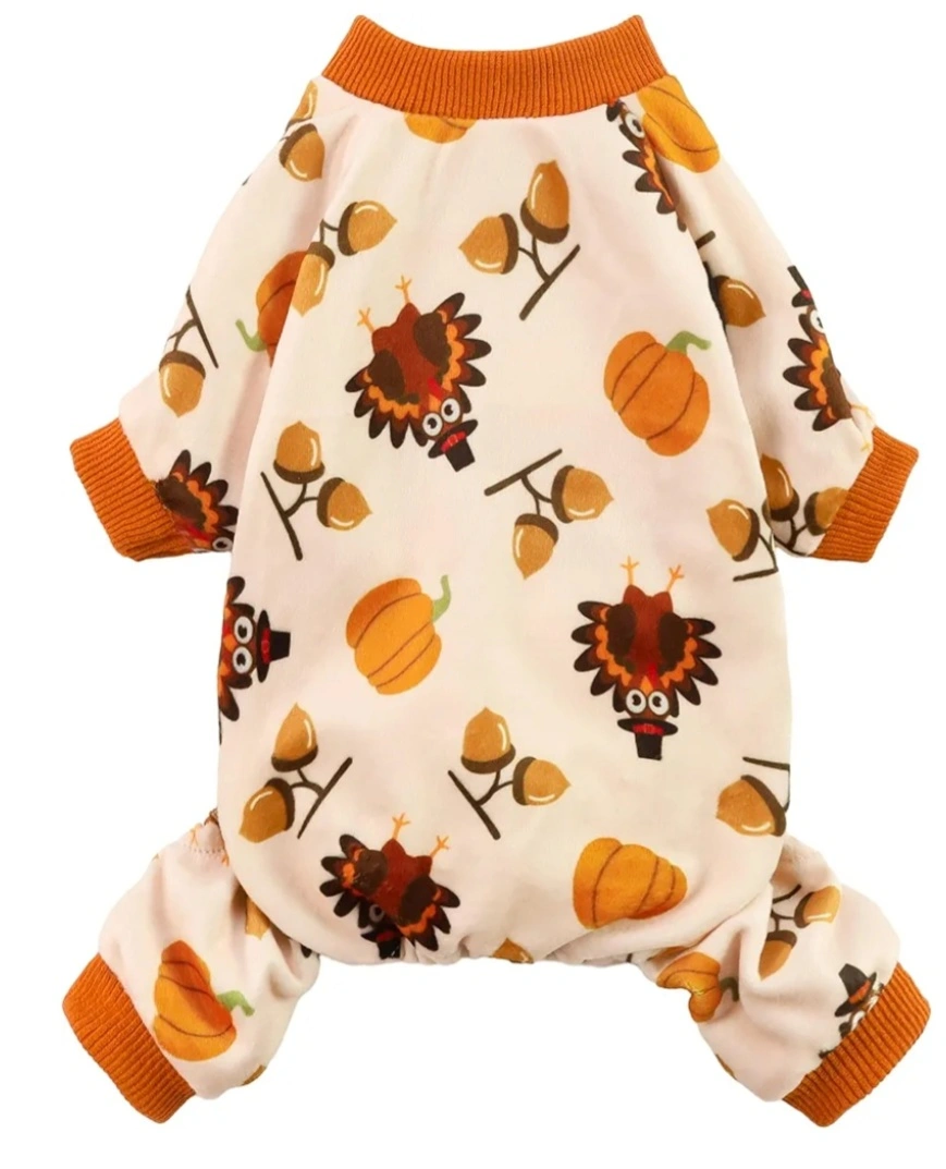 Cute dog pajamas featuring a Thanksgiving turkey design. Soft material, perfect for colder weather. Small Dog.