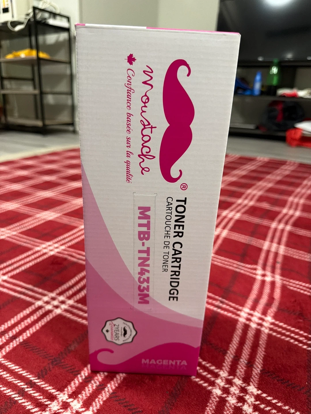 Selling a Moustache magenta toner cartridge, model MTB-TN433M. It's compatible with several Brother printer models. The box is included!