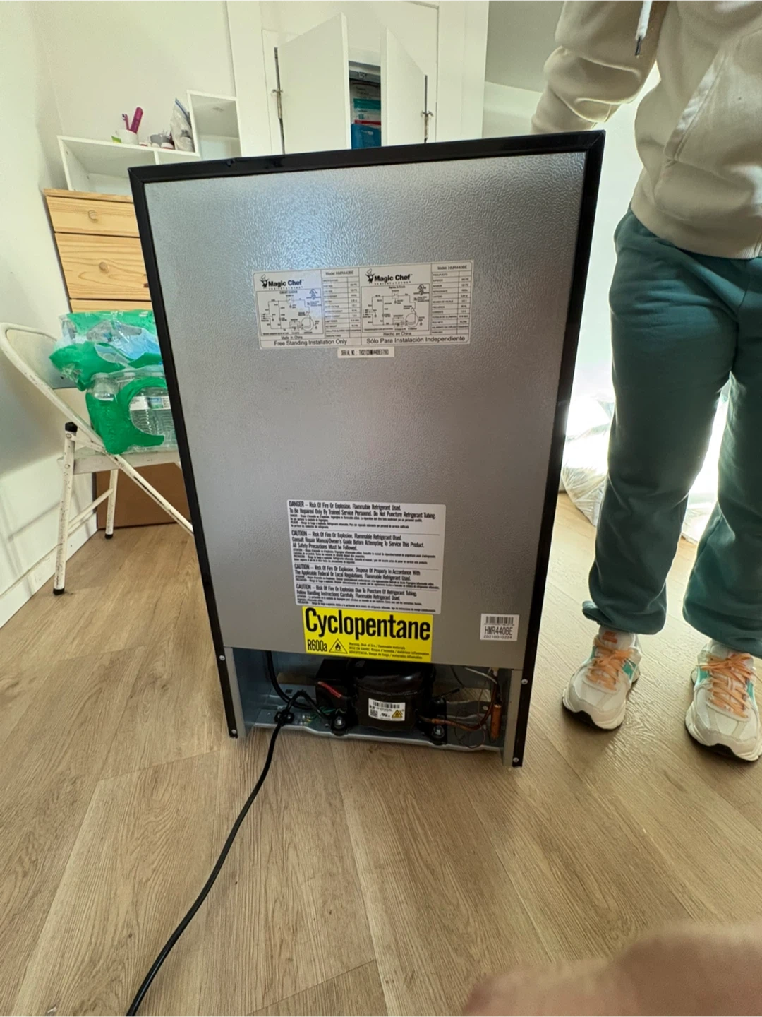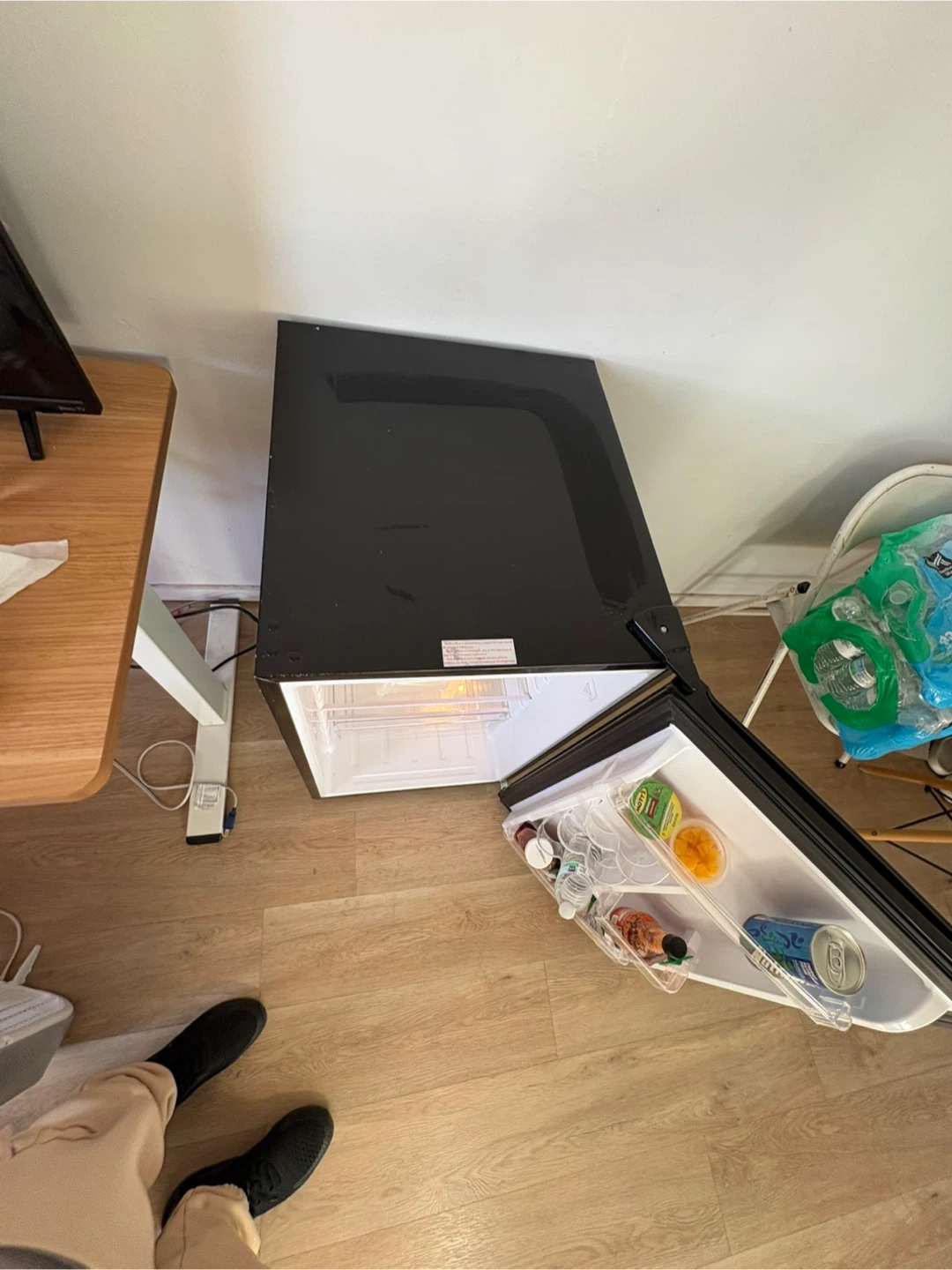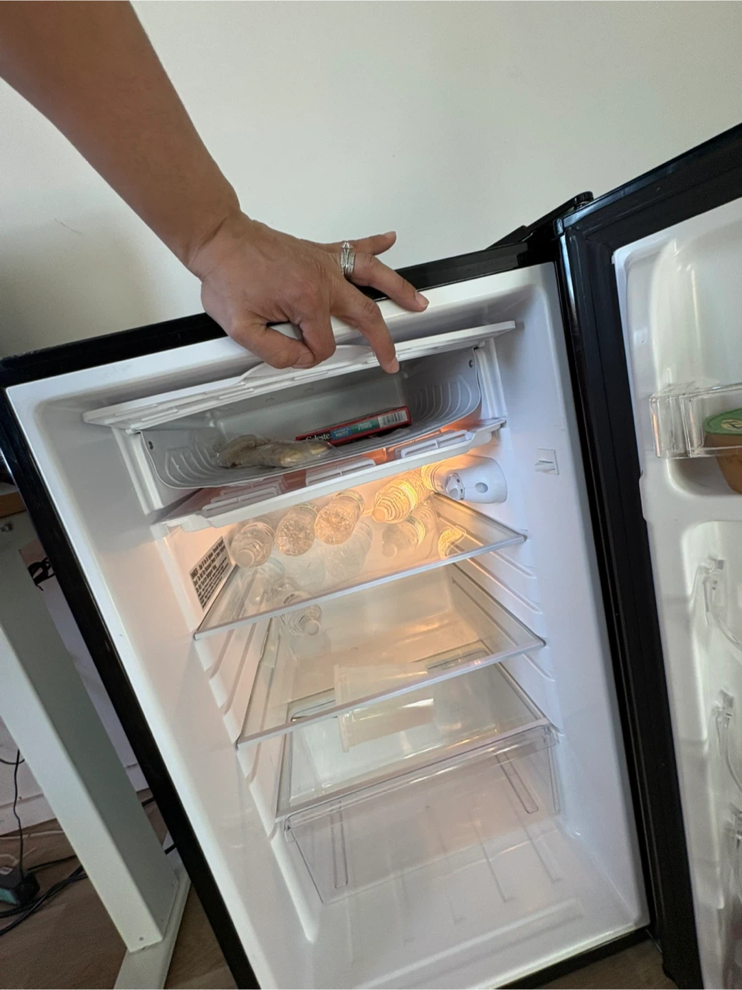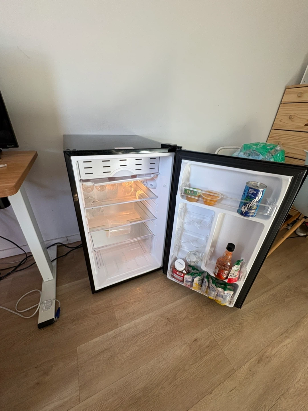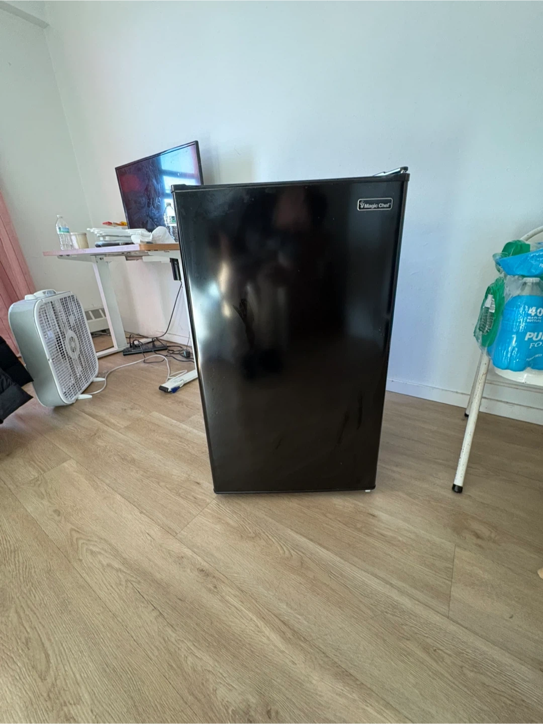 Moving must go ASAP. This is a Magic Chef mini refrigerator in black. It's perfect for keeping drinks and snacks cool. The unit includes adjustable shelves and a door bin for additional storage.