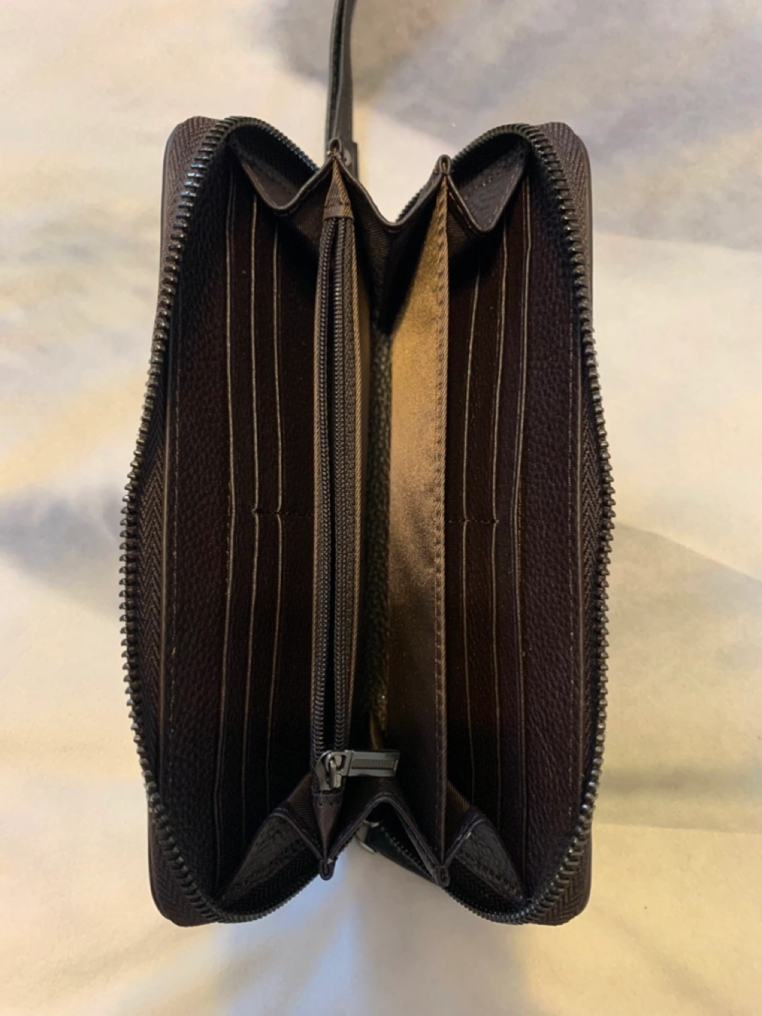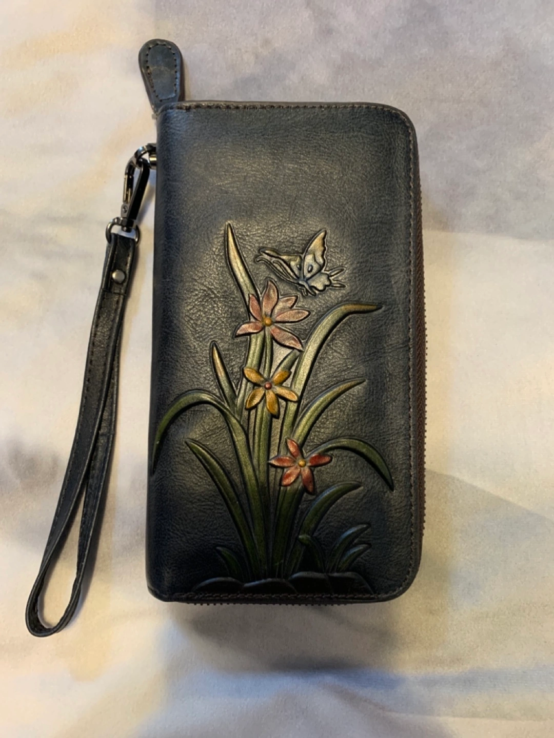 Genuine leather wallet with engraved flower and butterfly design, includes a wrist strap. Zipper closure.