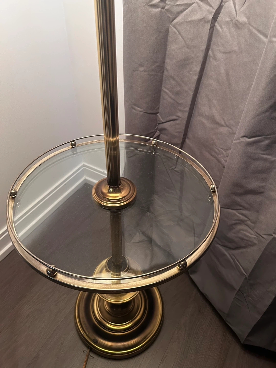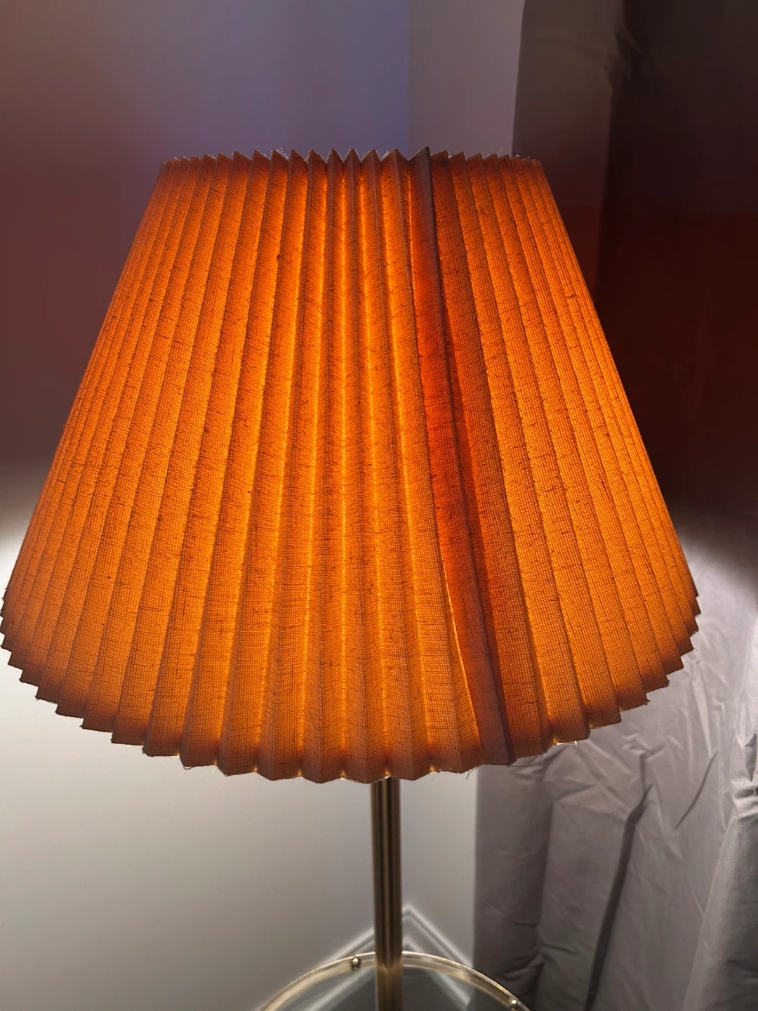 This classic floor lamp has a brass finish and a pleated orange lampshade. It features a built-in glass side table for convenience. Adds a warm glow and a handy spot for your drink! 150cm tall.