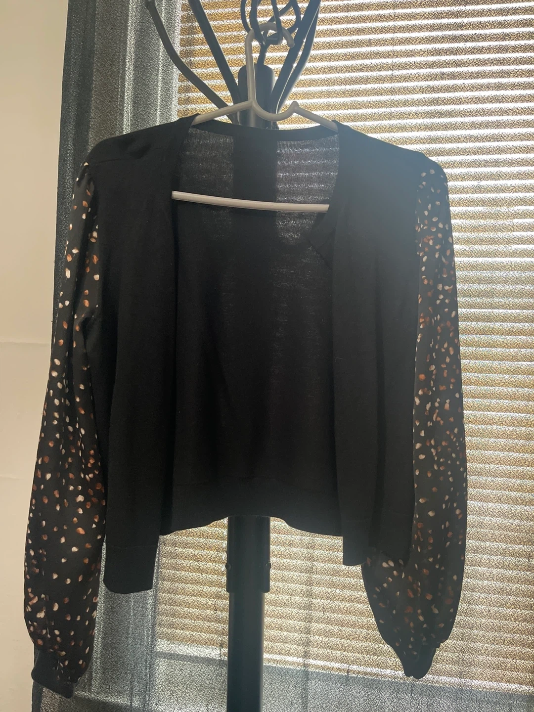 Black knit cardigan with sheer sleeves featuring a scattered print. It's a stylish layering piece for any outfit. The sleeves add a unique touch. Material is soft and comfortable.