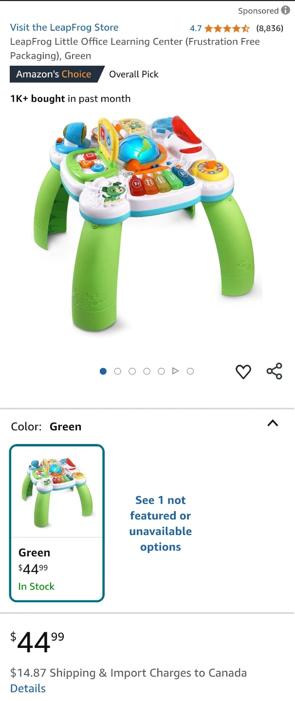Interactive learning table for toddlers. Features lights, sounds, and various activities. Great for developing fine motor skills and learning colours, numbers, and letters. Green and white colour scheme. Used condition.