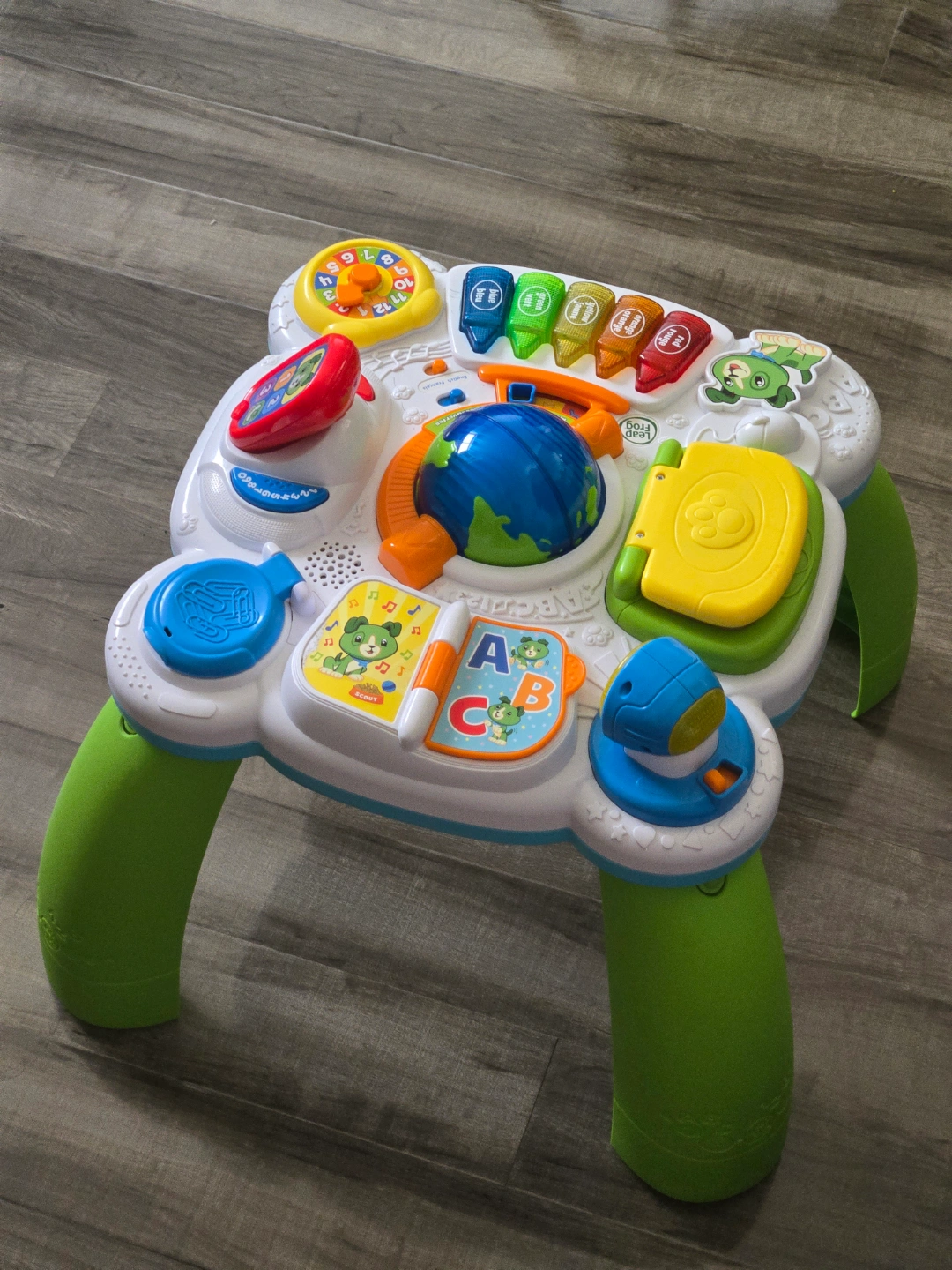 Interactive learning table for toddlers. Features lights, sounds, and various activities. Great for developing fine motor skills and learning colours, numbers, and letters. Green and white colour scheme. Used condition.
