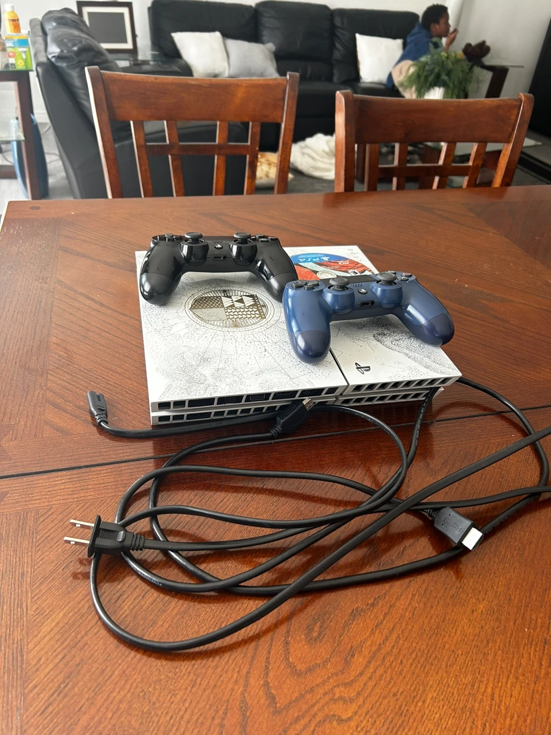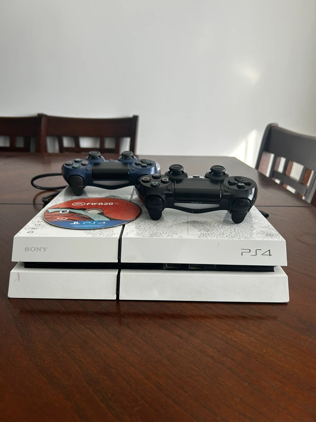 Selling a white Sony PlayStation 4 Pro console with 1TB storage. It comes with two DualShock 4 controllers and the FIFA 20 game disc. This bundle is great for multiplayer gaming sessions or enjoying solo adventures!