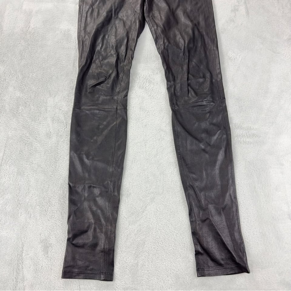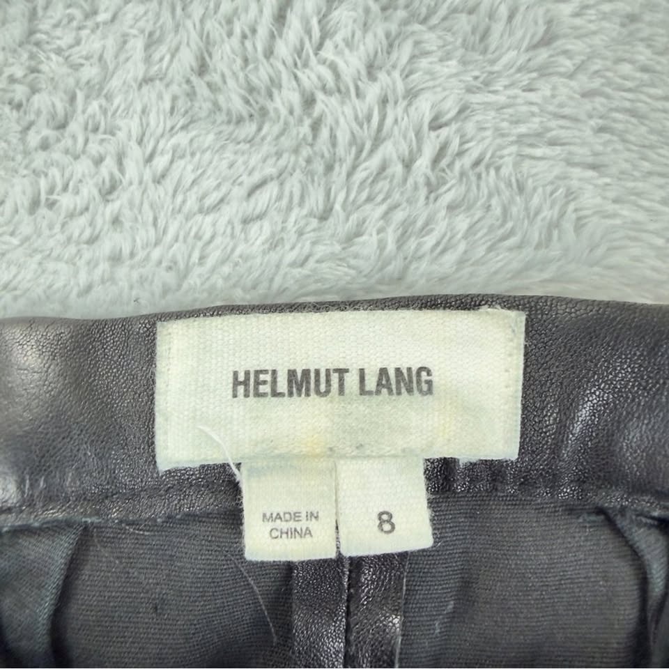 Helmut Lang Women's Size 8 Black Crashed 100% Lamb Leather Slim Pants in good pre-owned condition. Style: SW-PT0177. Shell: 100% Lamb Leather. Lining: 100% Cotton. Made in China. Measurements: Waist 15", Length/Outseam 43", Rise 9", Inseam 33.5", Hips 17.5", Leg Opening 5". Size 8 (30 Waist x 33 Length). Color Black. Brand Helmut Lang. See photos for reference.