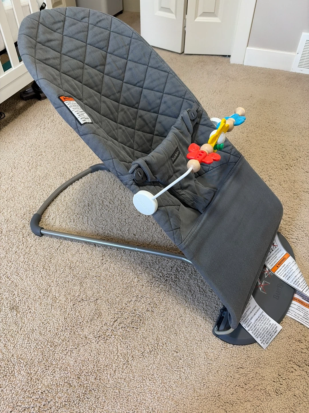 This BabyBjörn bouncer is designed for babies up to two years old. It features a soft quilted fabric and includes a fun toy bar. The bouncer is grey and made with durable materials. It's perfect for letting your little one rest or play safely.
