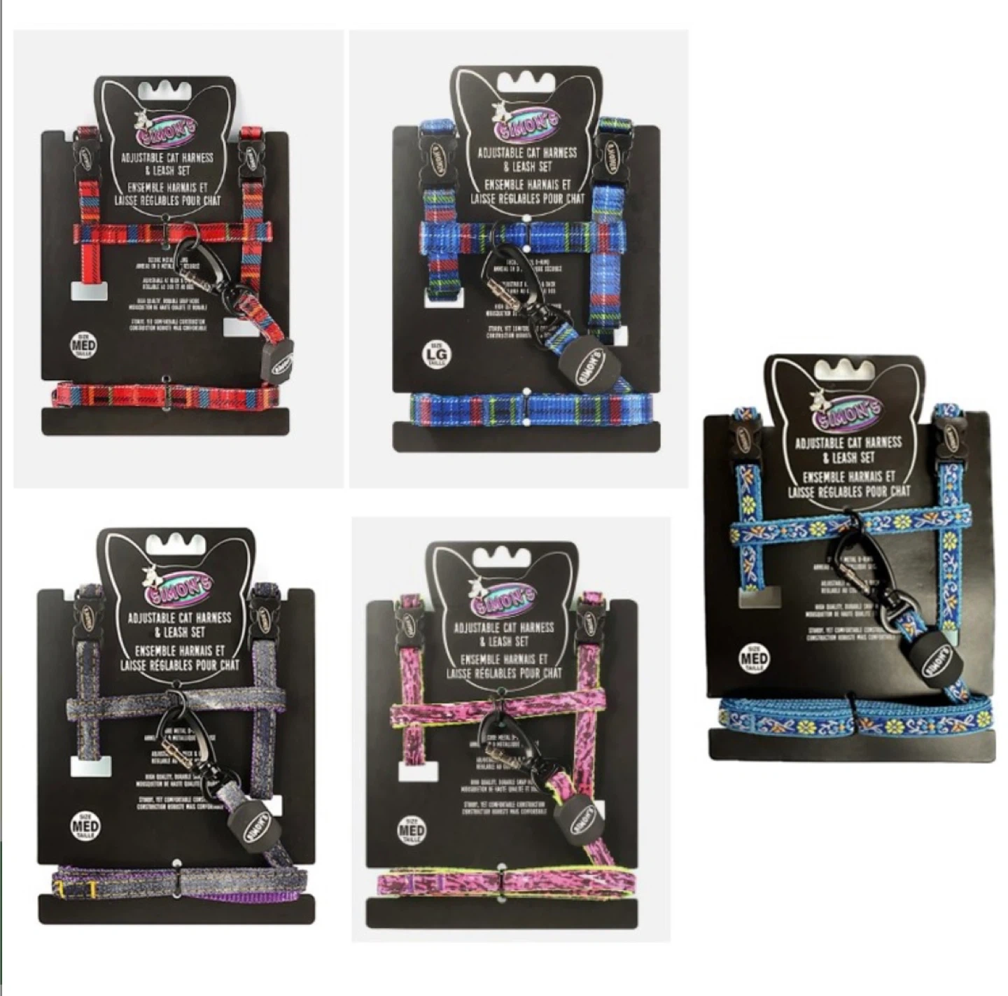 This set includes an adjustable cat harness and a matching leash. Various sizes and colourful plaid and floral patterns are available. It's designed for a secure and comfortable fit for your feline friend. The harness features adjustable straps for a customizable fit.