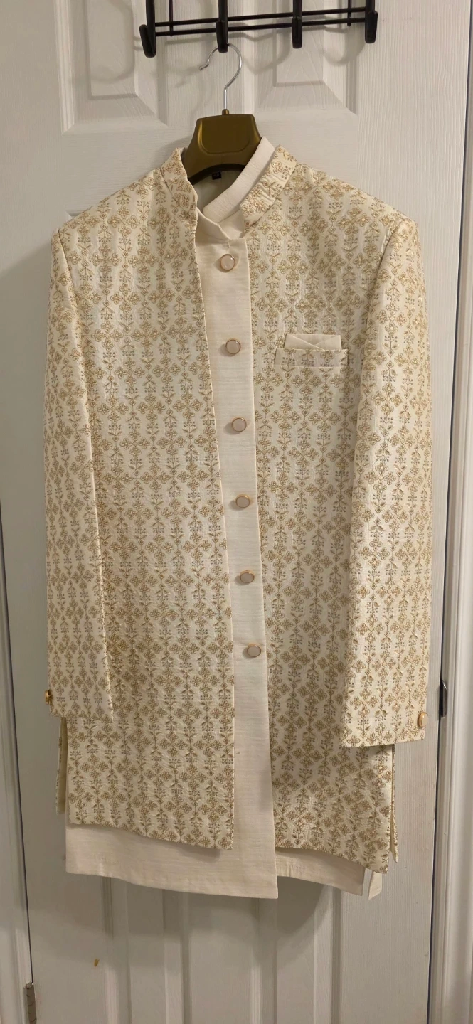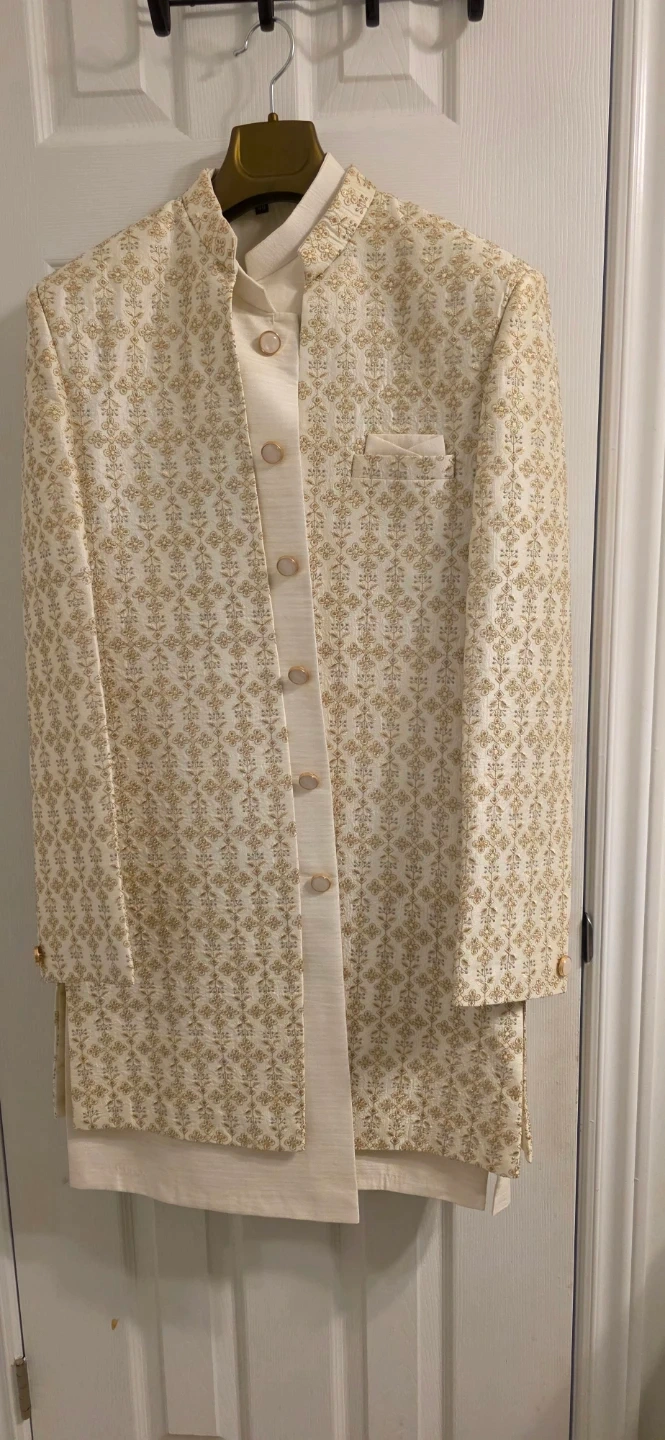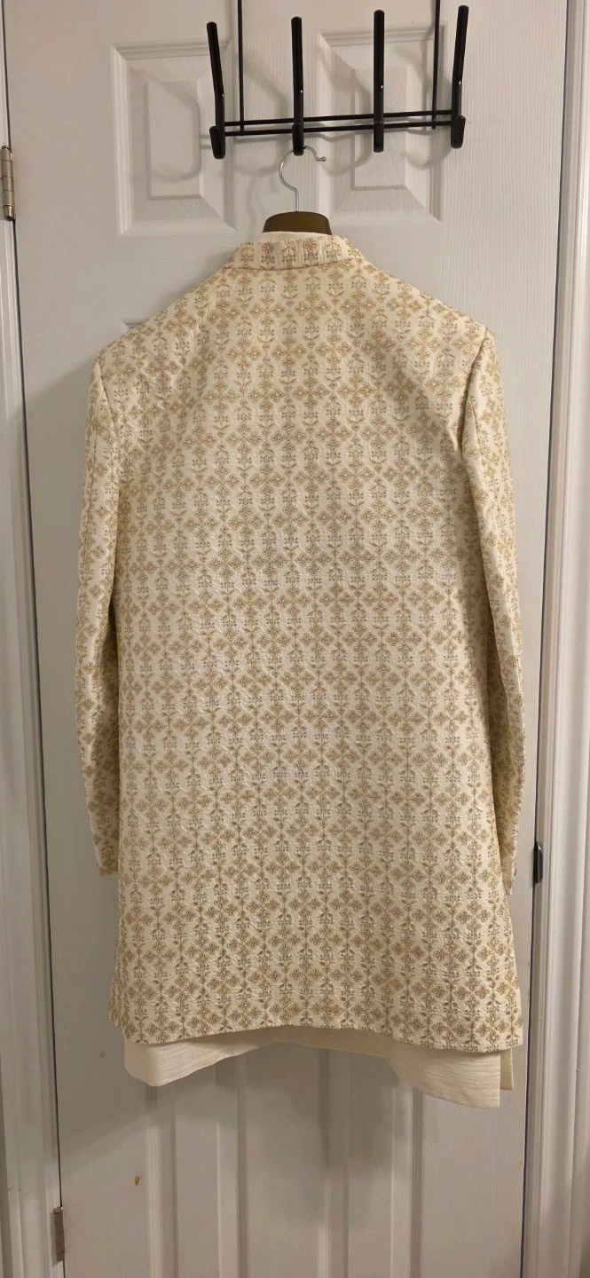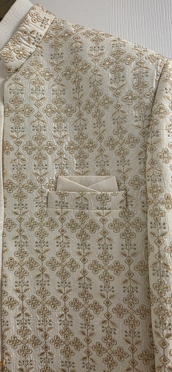 A cream-coloured sherwani with intricate gold embroidery all over. It features a mandarin collar and button-down front. This is a festive garment, often worn for special occasions and weddings. Ideal for cultural events or formal gatherings.