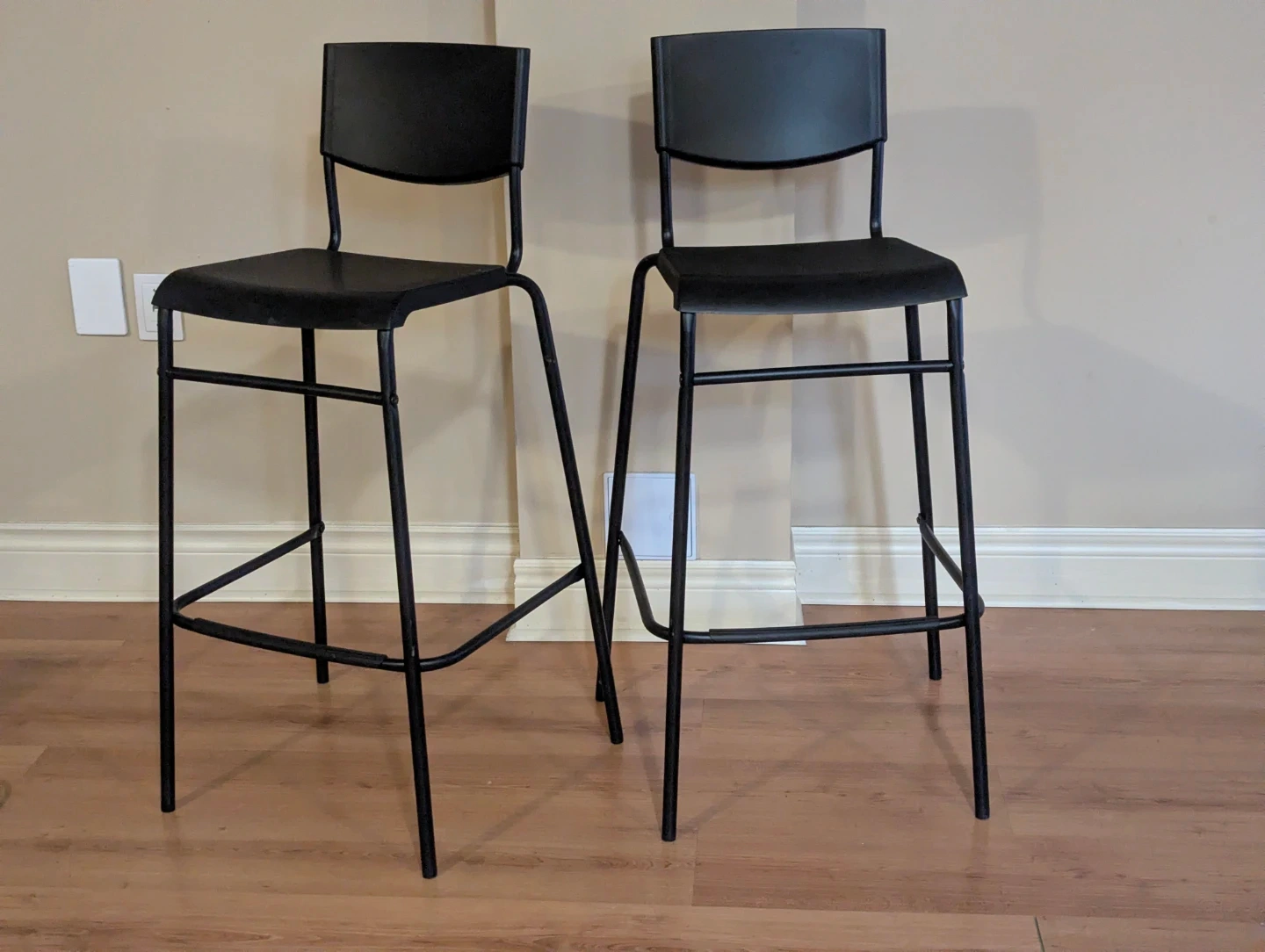Two black metal bar stools with moulded plastic seats and backrests. These stools have a modern design with a sturdy frame and footrests. They're great for a kitchen island or home bar setup. Metal frame with plastic seats.