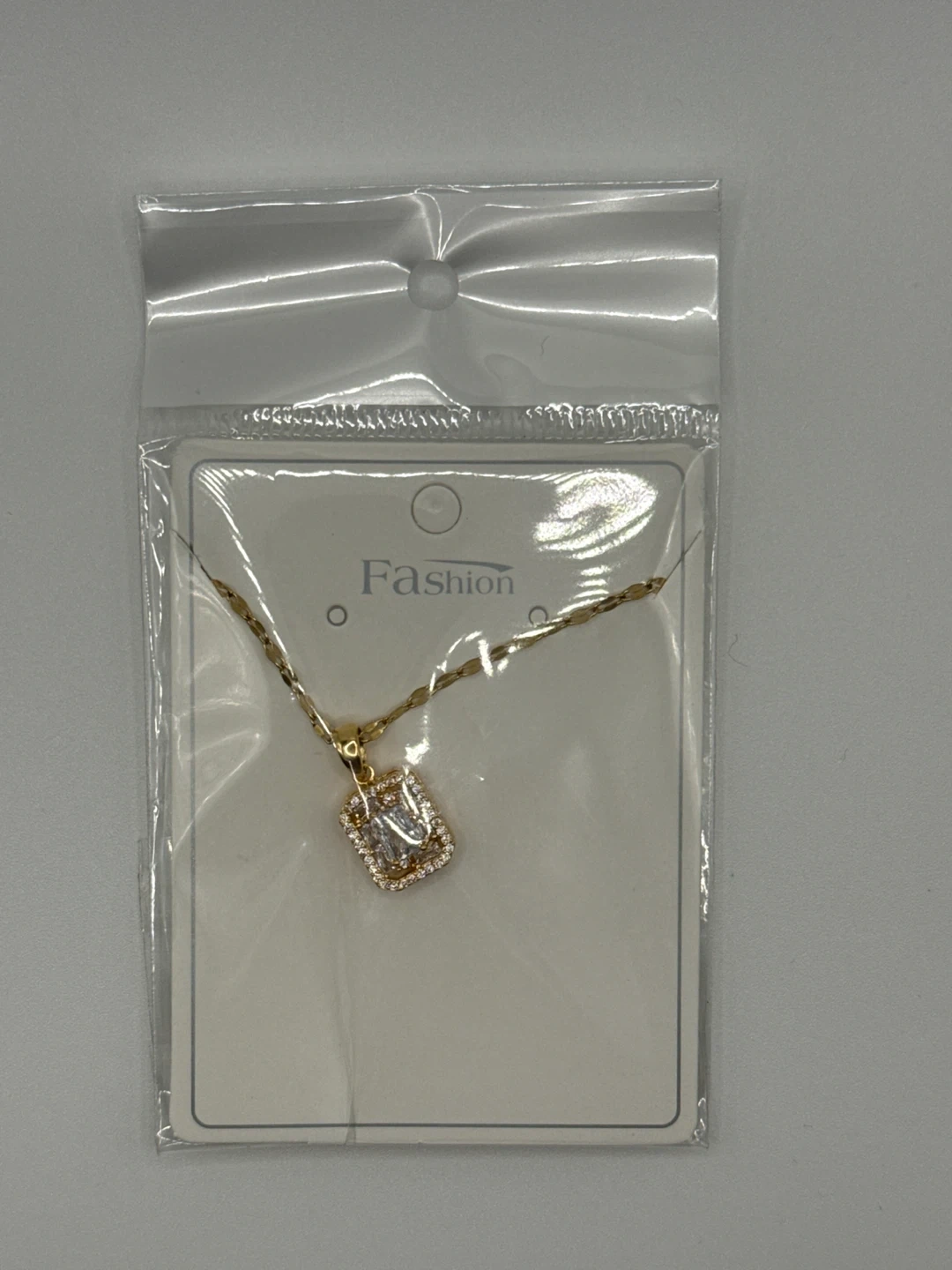 This necklace features a gold-tone chain with a pendant. The pendant is square-shaped and encrusted with clear rhinestones. It's sealed in its original packaging.