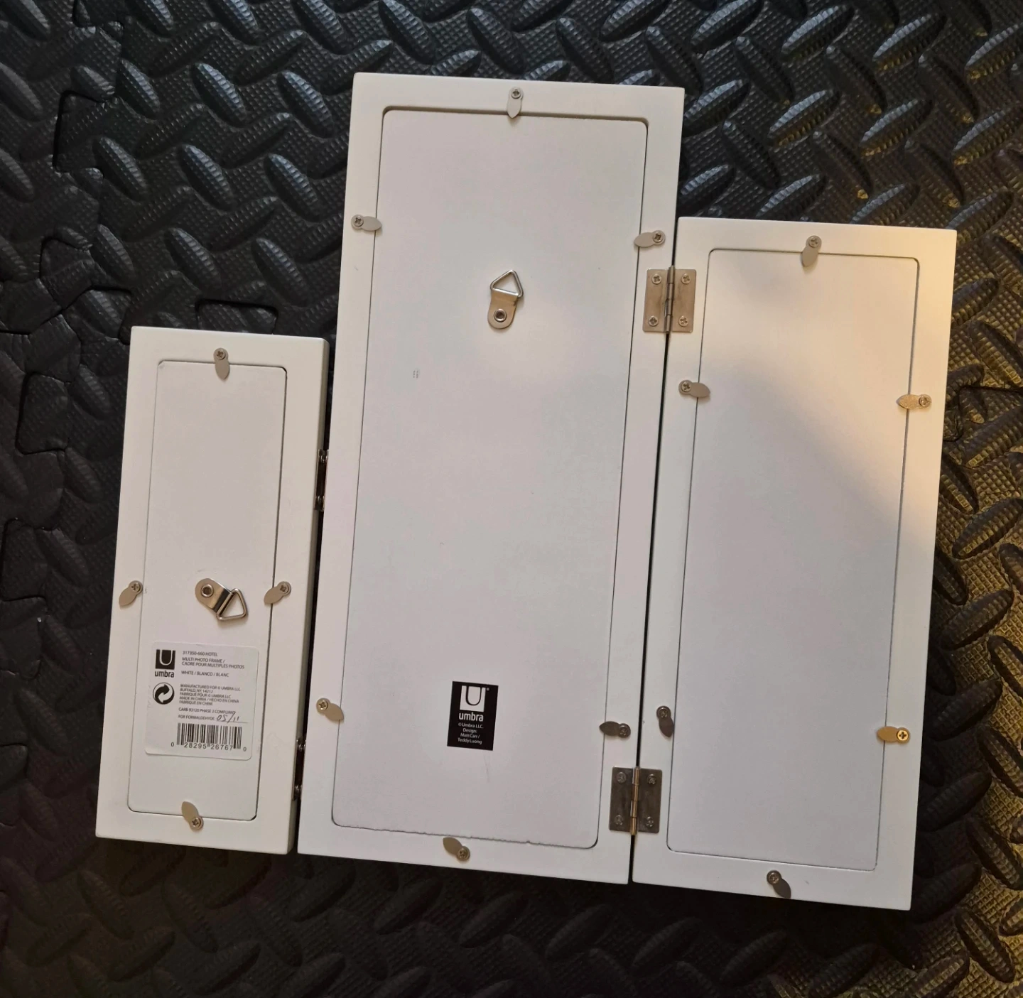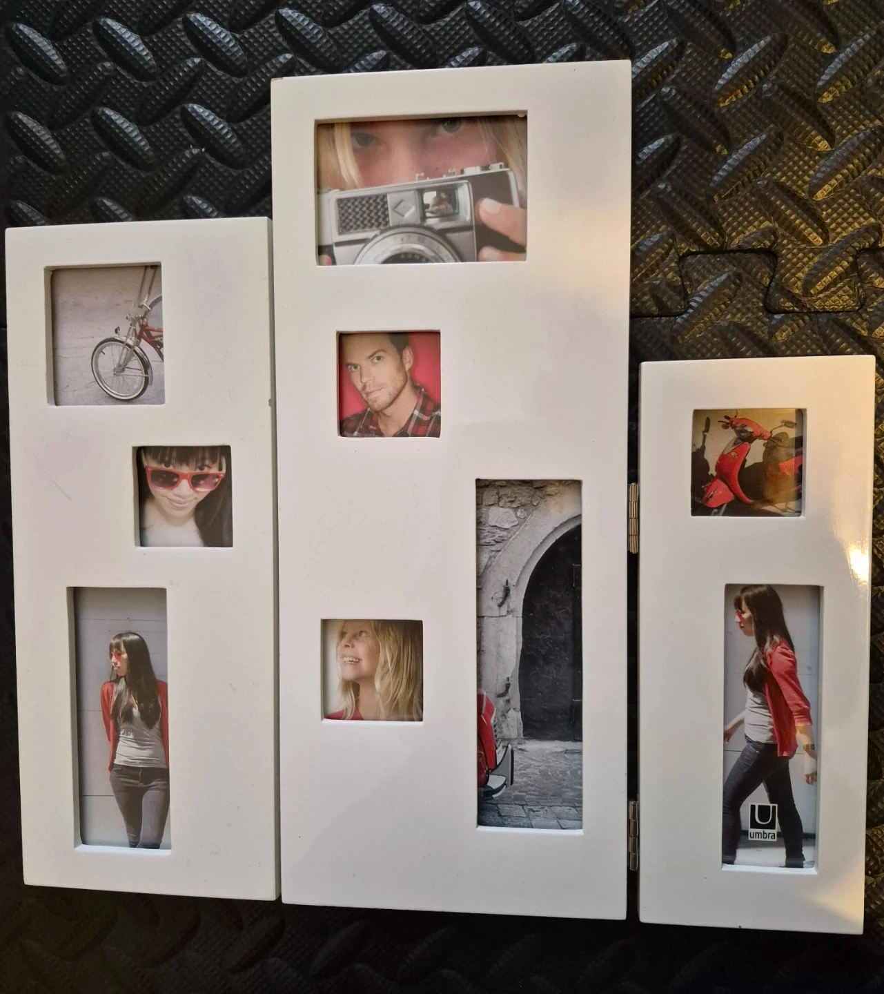 Umbra white tri-fold photo frame. It holds multiple pictures to create a collage. This frame is great for displaying cherished memories!