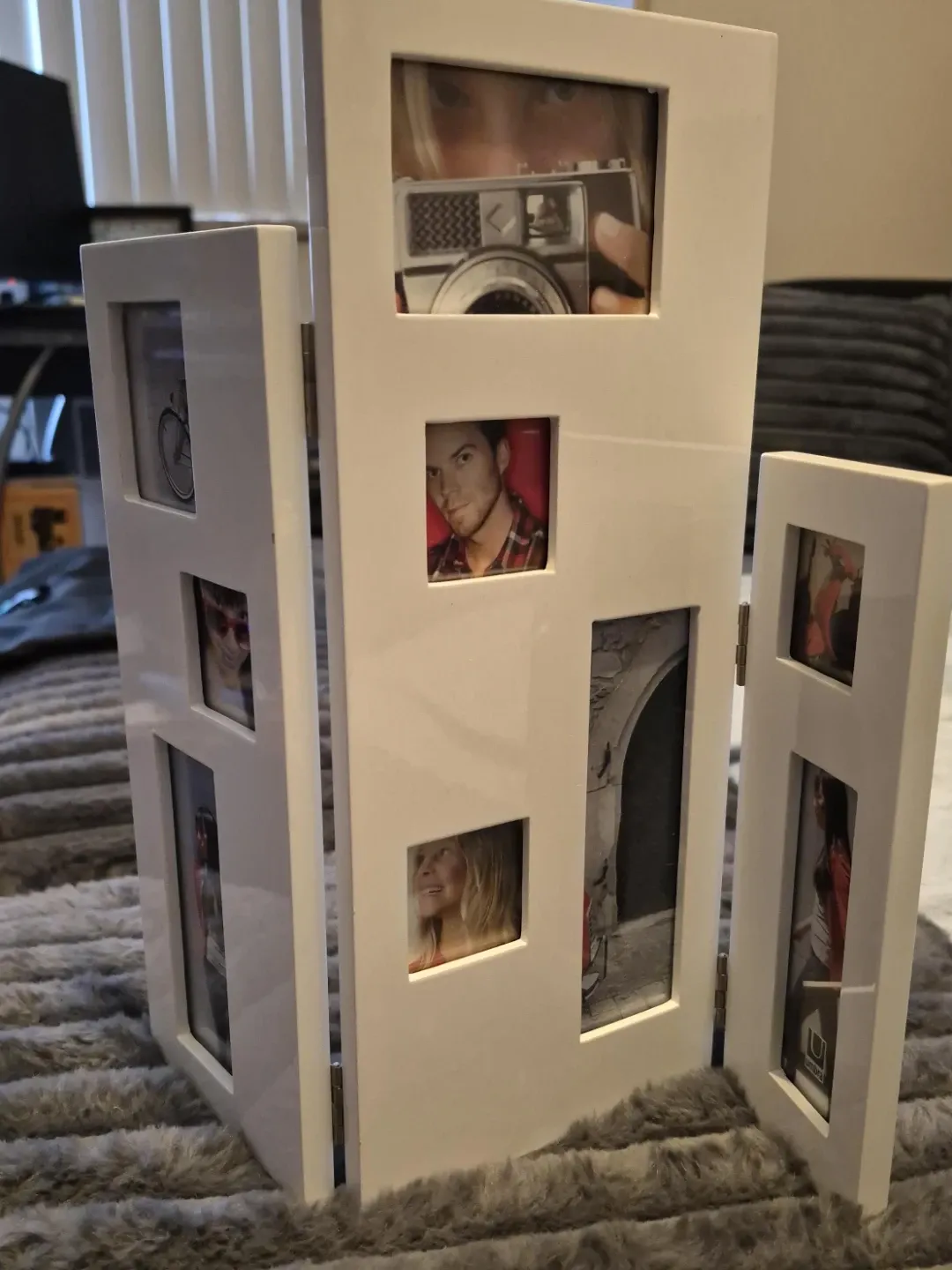 Umbra white tri-fold photo frame. It holds multiple pictures to create a collage. This frame is great for displaying cherished memories!