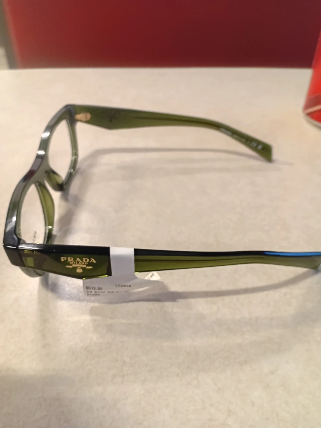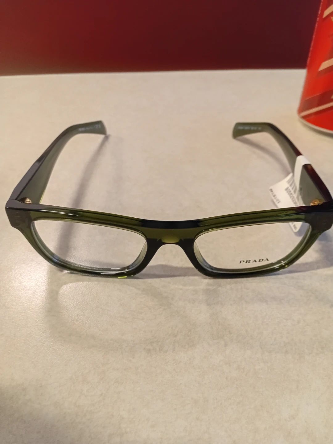 Prada eyeglasses in a stylish green hue. These frames are a fantastic choice for updating your look with a touch of designer flair. Perfect for everyday wear or for special occasions!