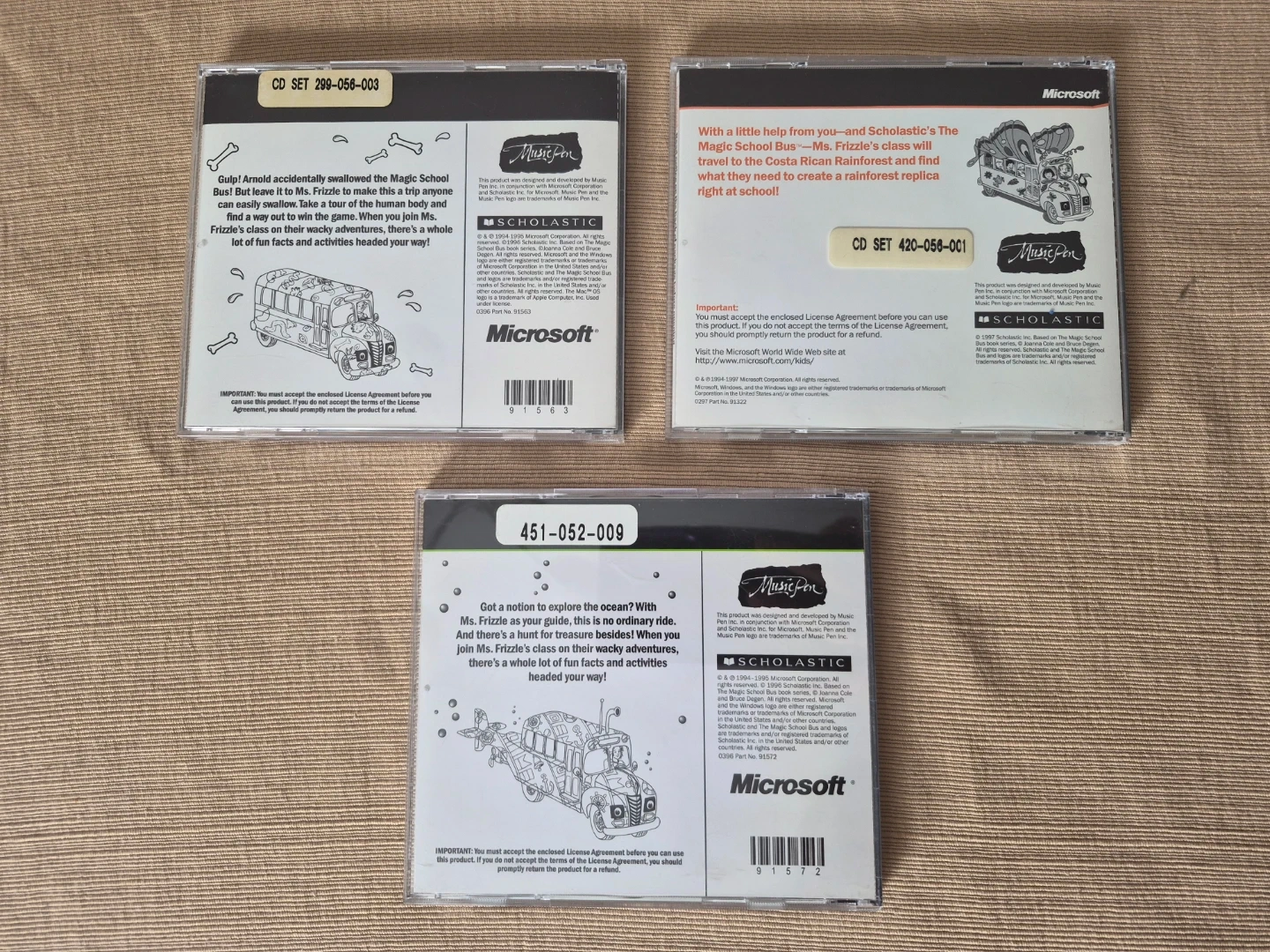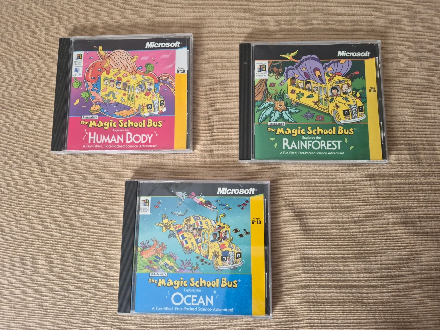 This bundle includes three Microsoft Magic School Bus CD-ROM educational games: The Human Body, Rainforest, and Ocean. These games are designed for ages 6-10. They're a fun and fact-filled science adventure for kids!