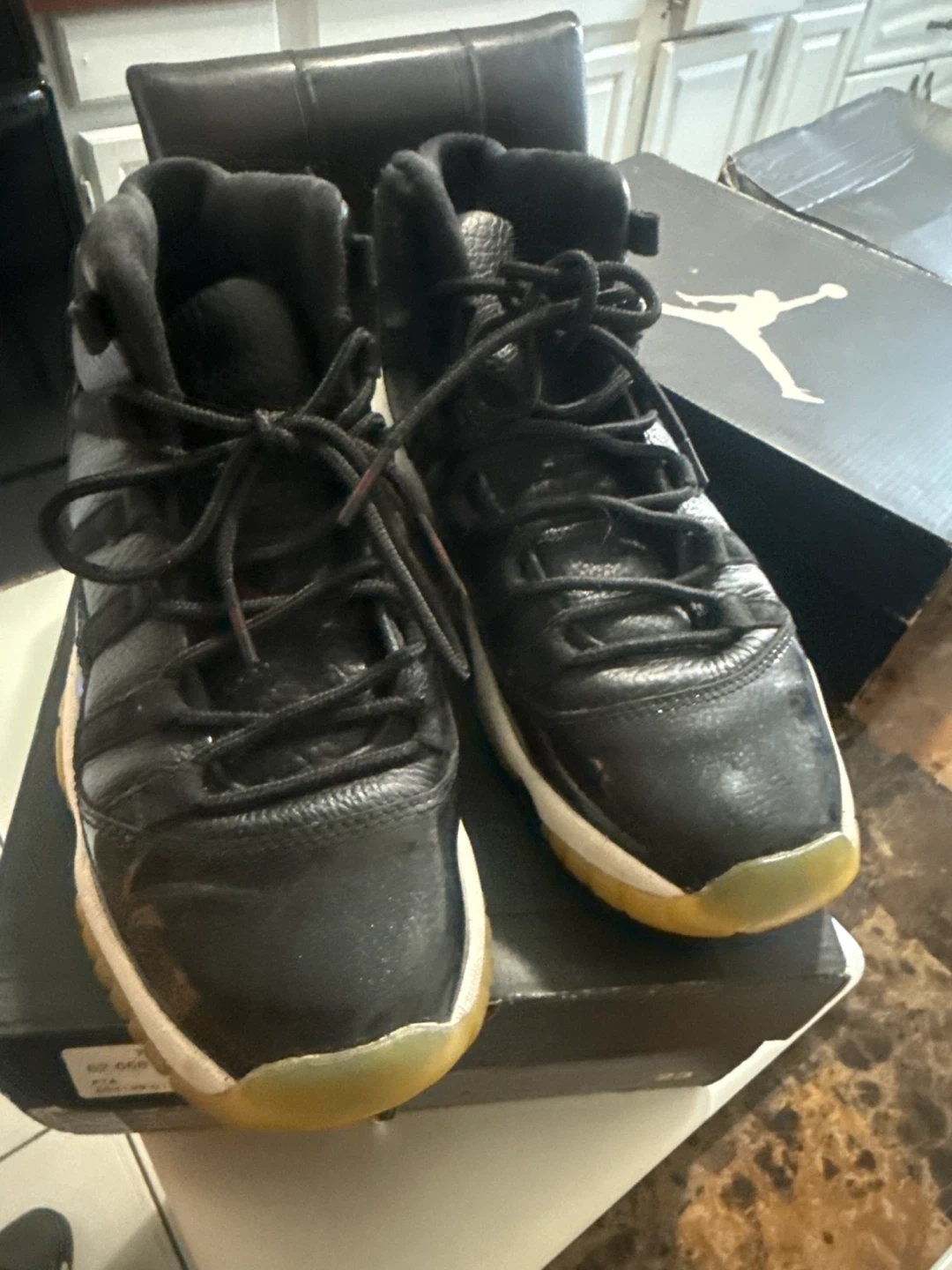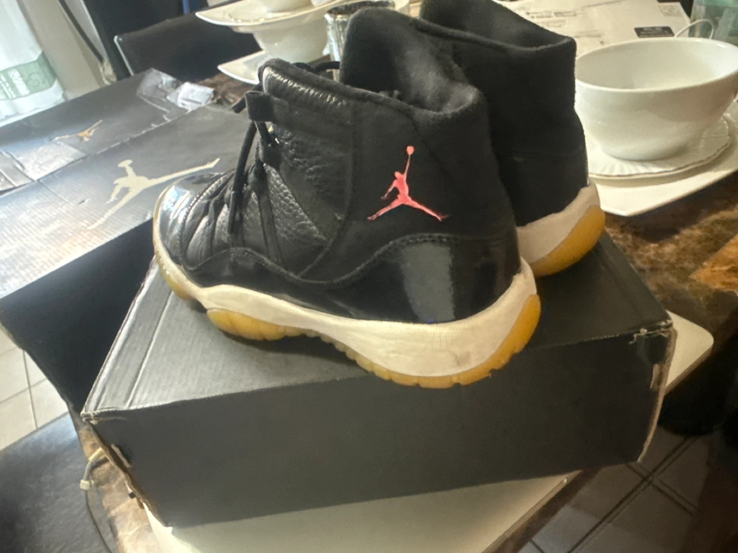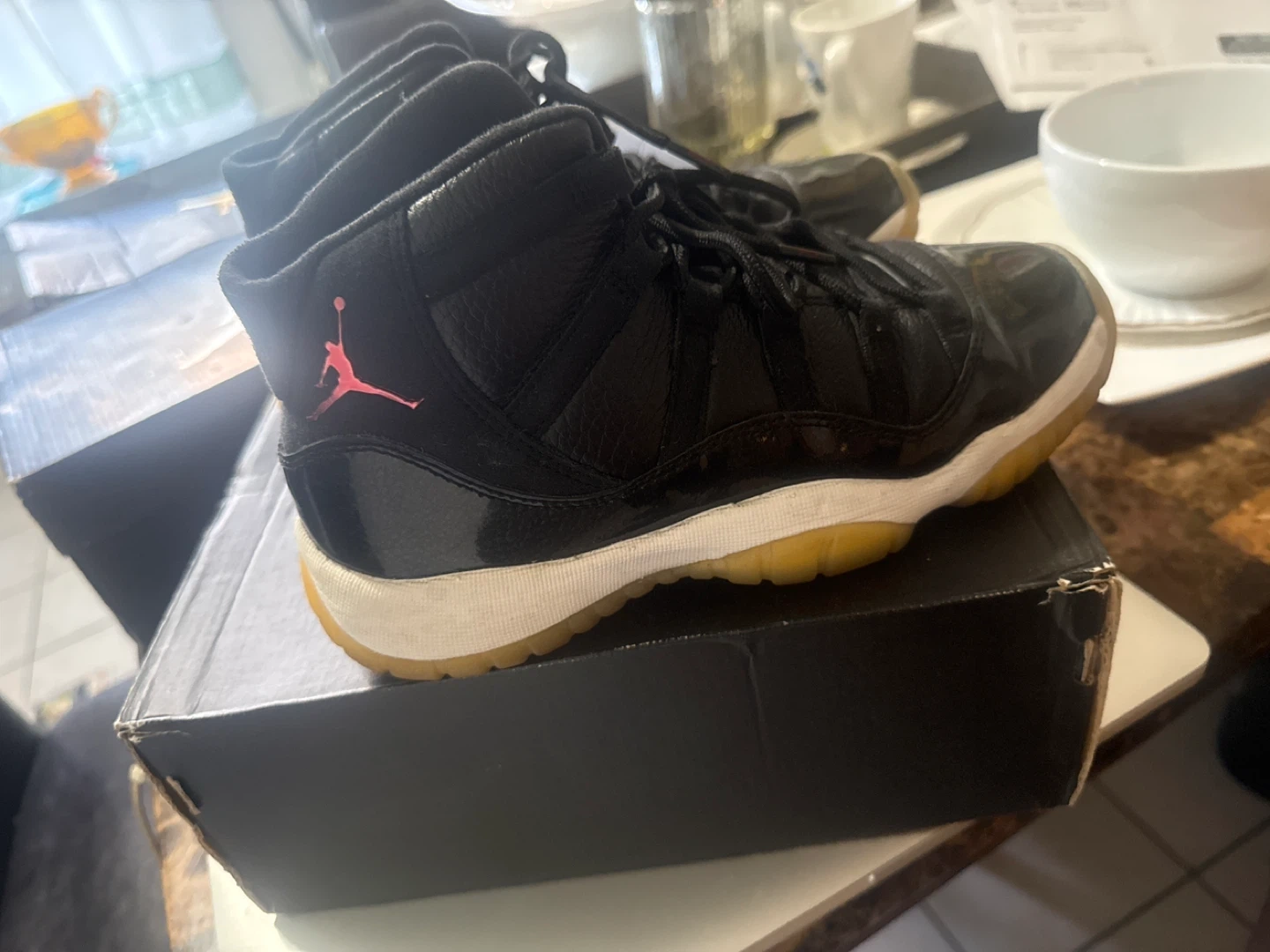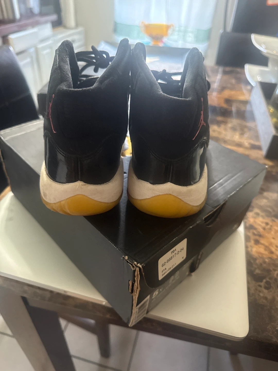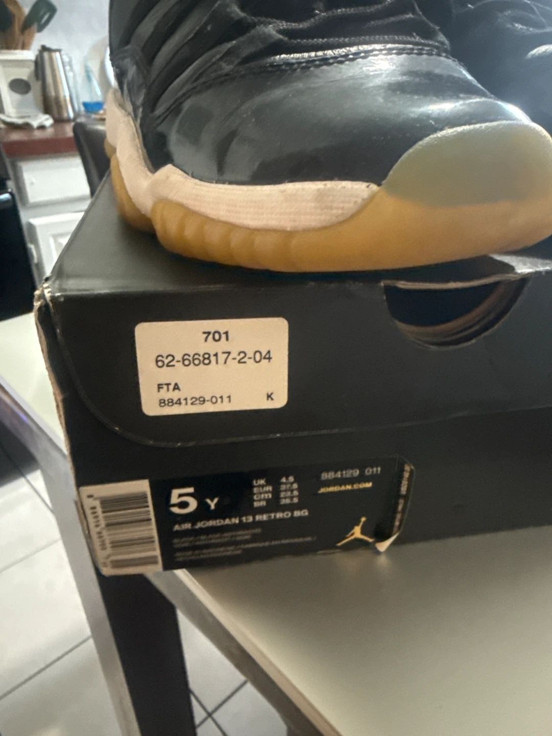 Black Air Jordan 13 Retro BG shoes. Features pink Jumpman logo and translucent yellow soles. Includes original box.