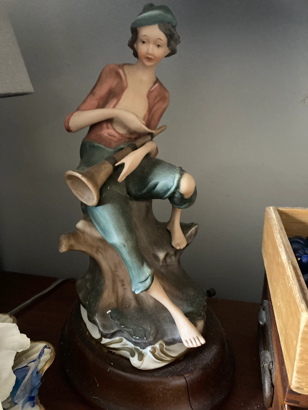 This is a vintage porcelain figurine depicting a young person holding a horn. The piece features detailed clothing and a naturalistic base. It's made of porcelain.