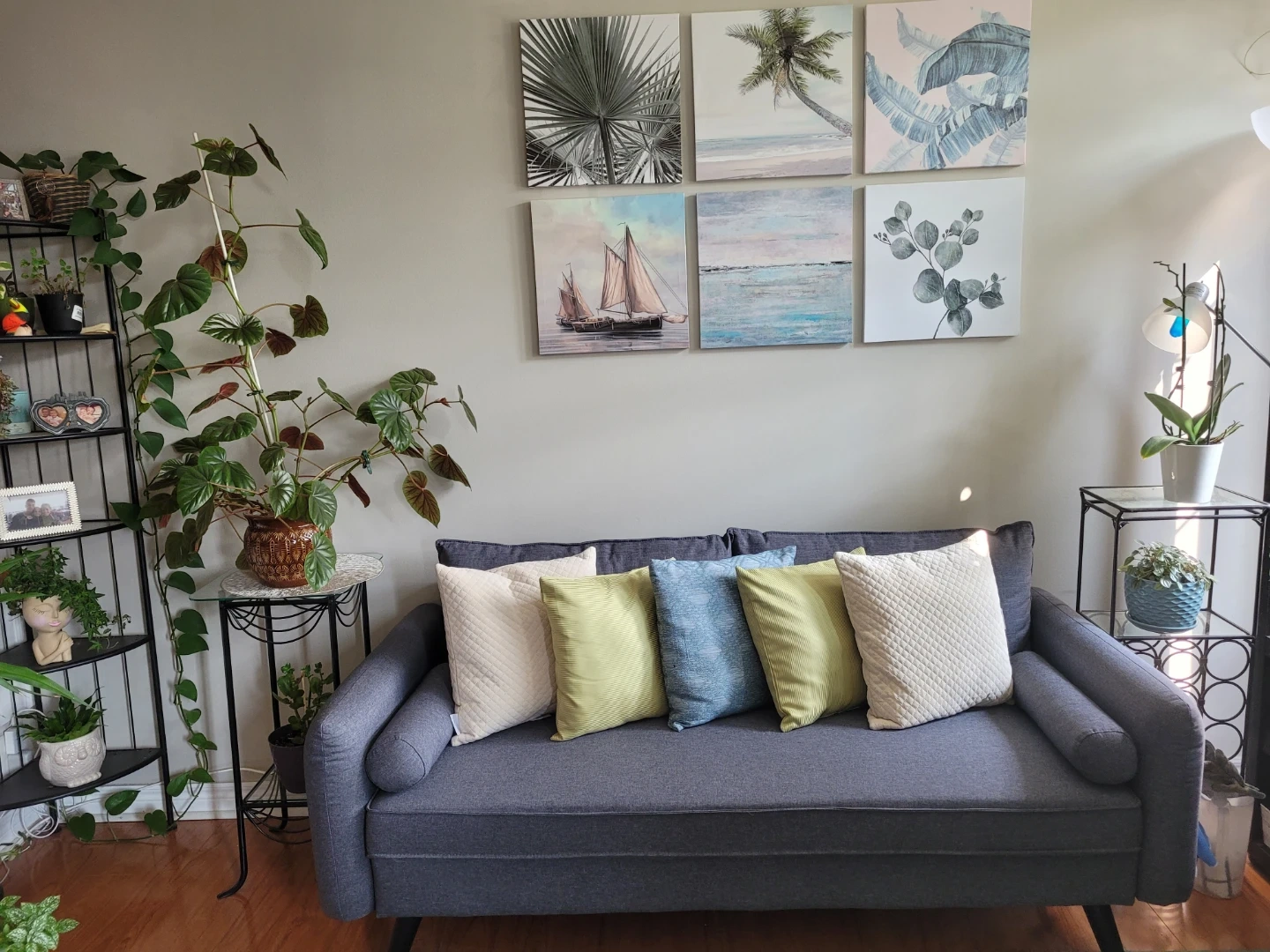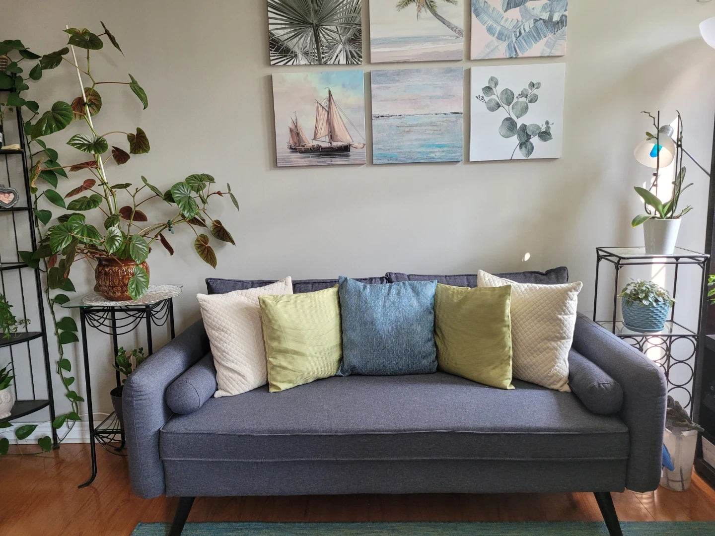 Selling a comfy couch with throw pillows, (if wanted). It's in great shape and would be perfect for a living room or den. The couch is a neutral gray colour. Very clean, hardly used, no rips, stains, marks.