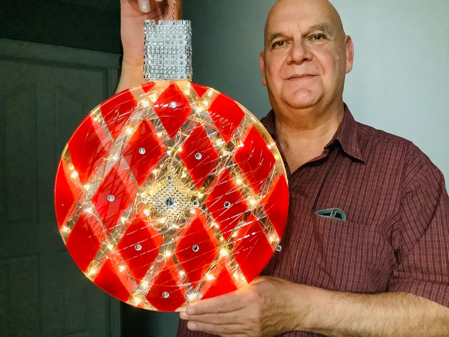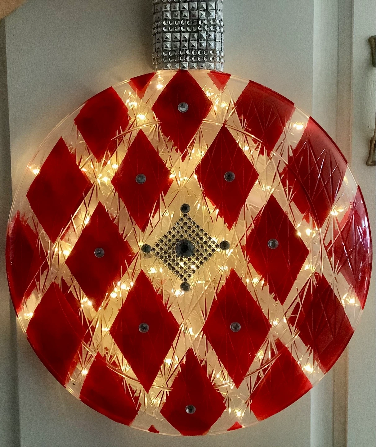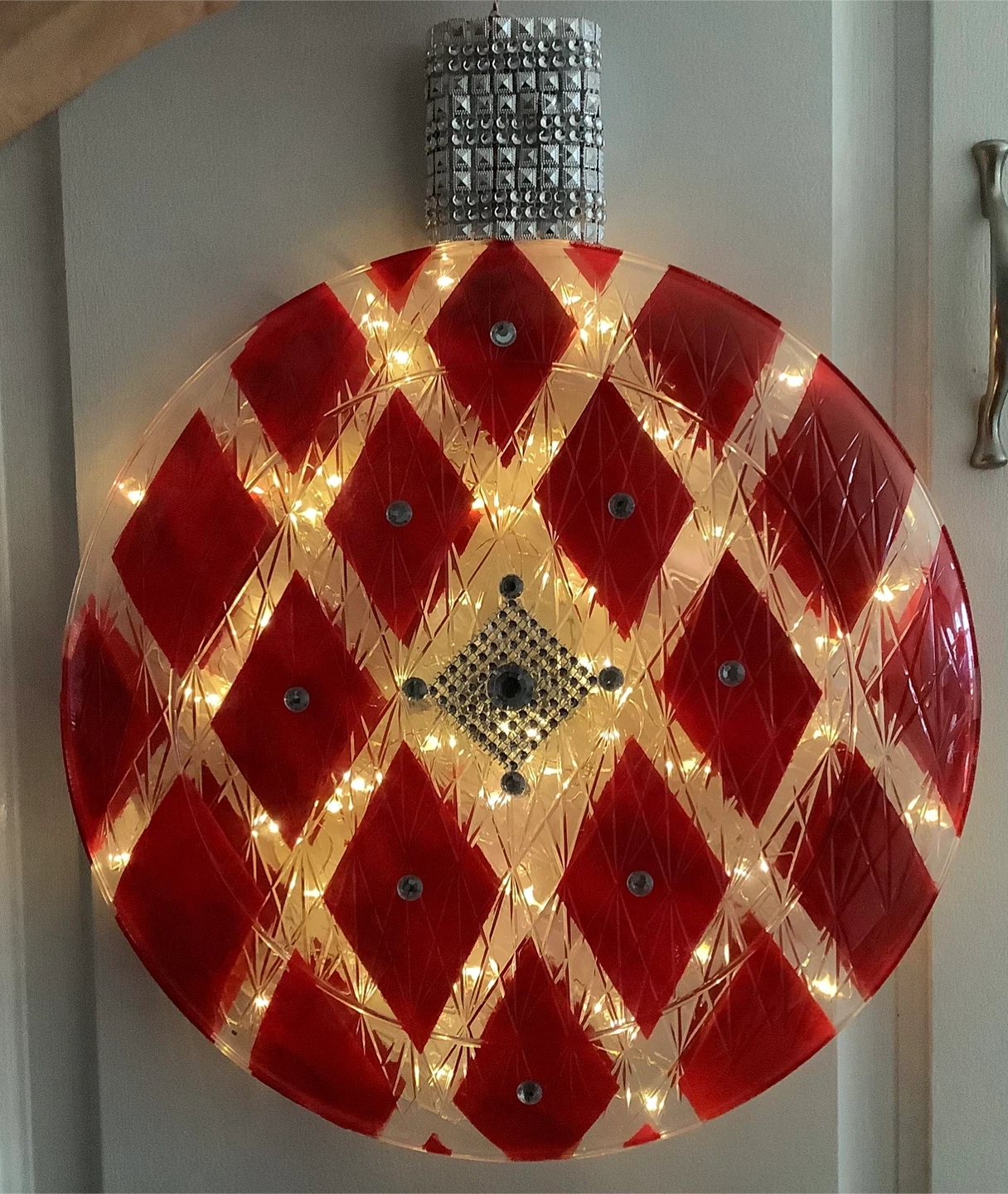 Selling a unique lighted ornament with a red diamond pattern! It's in great condition and would make a lovely addition to any room or holiday display. The lights add a warm and inviting glow of twinkling light.