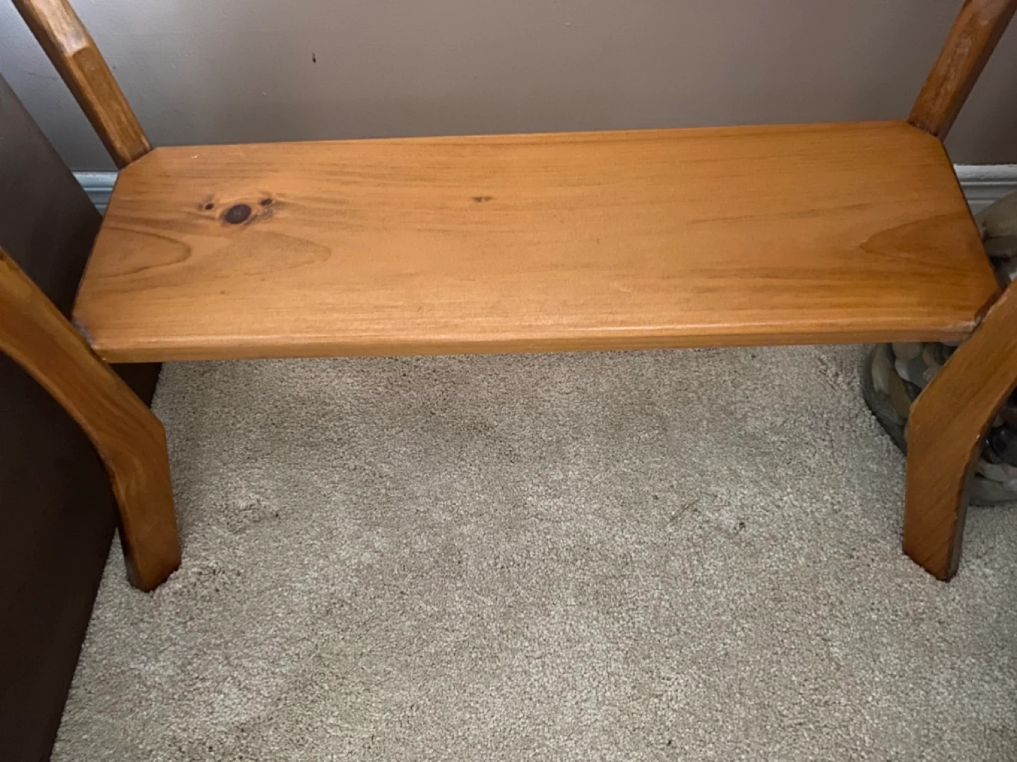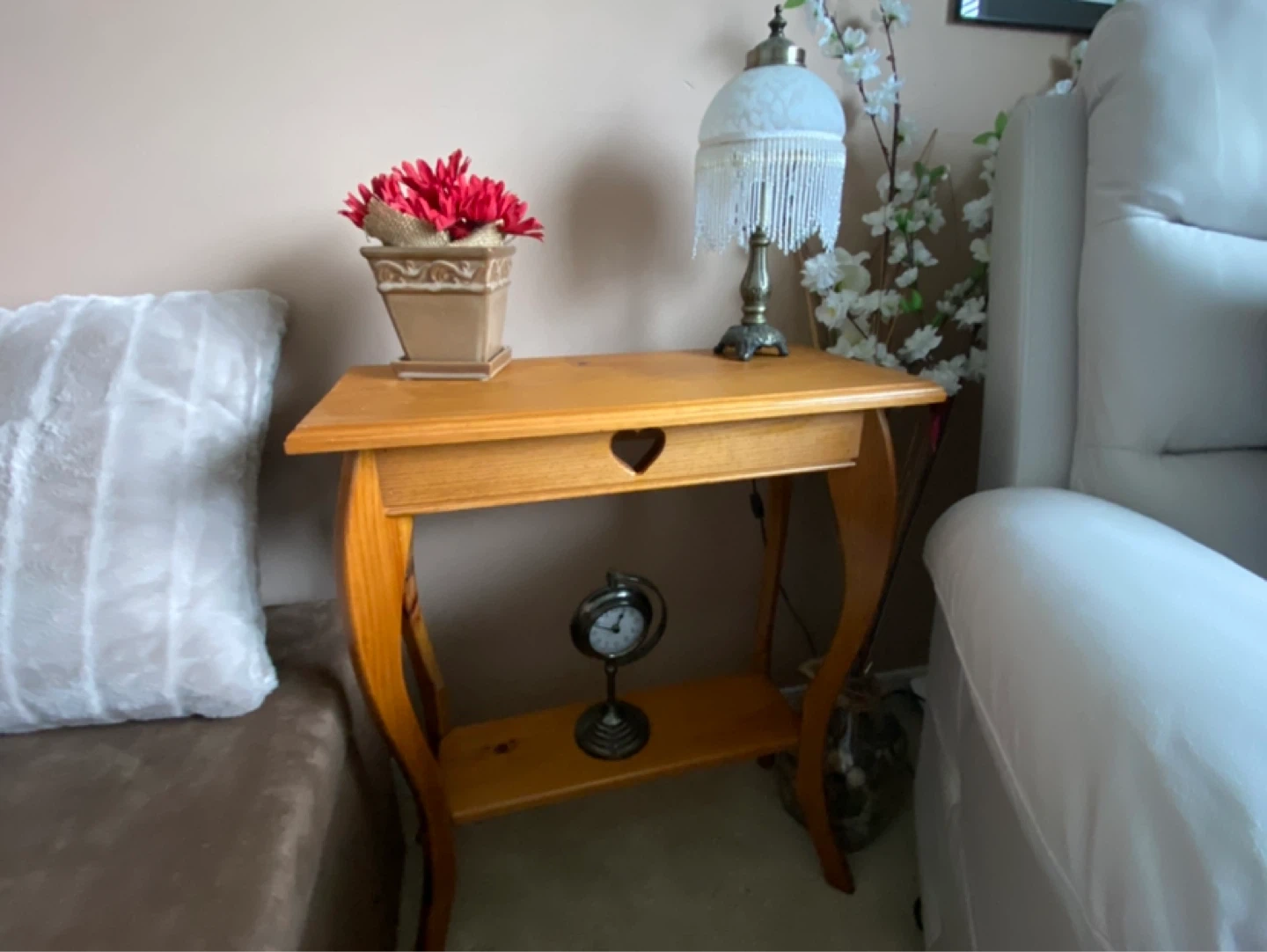 Solid vintage wood end table with decorative heart cutouts on the front and back of the table.