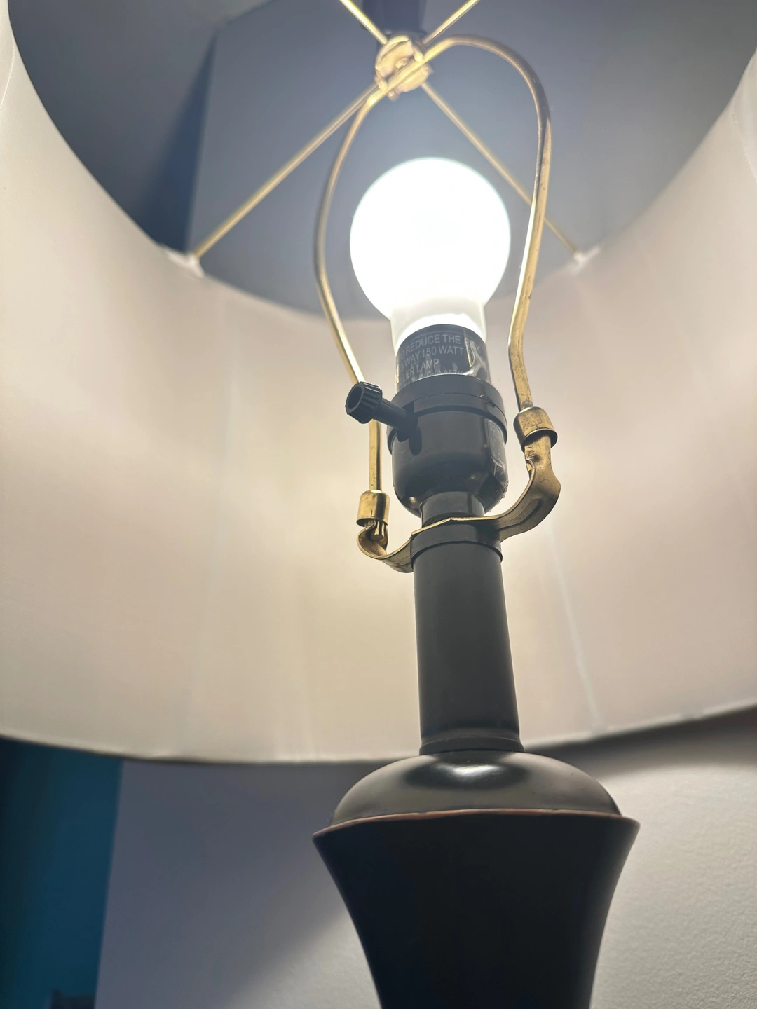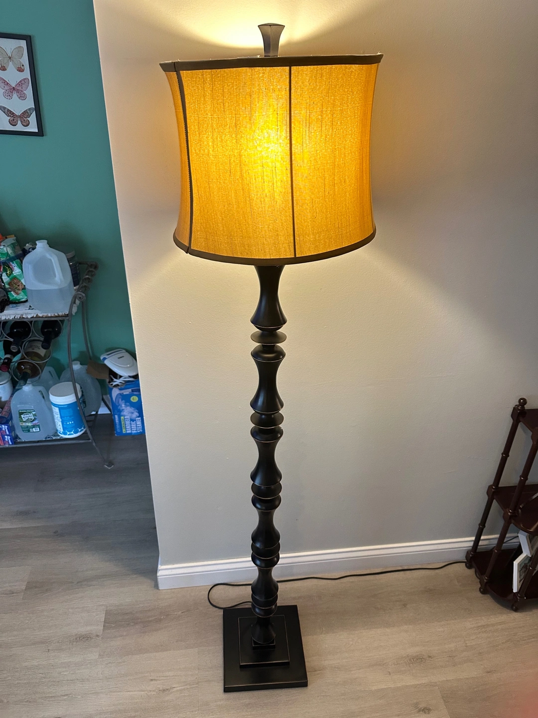 Here's a floor lamp with a brown finish that would look great in any room! It's in good condition and ready to brighten up your space. The lamp has a classic design and provides a warm, ambient light