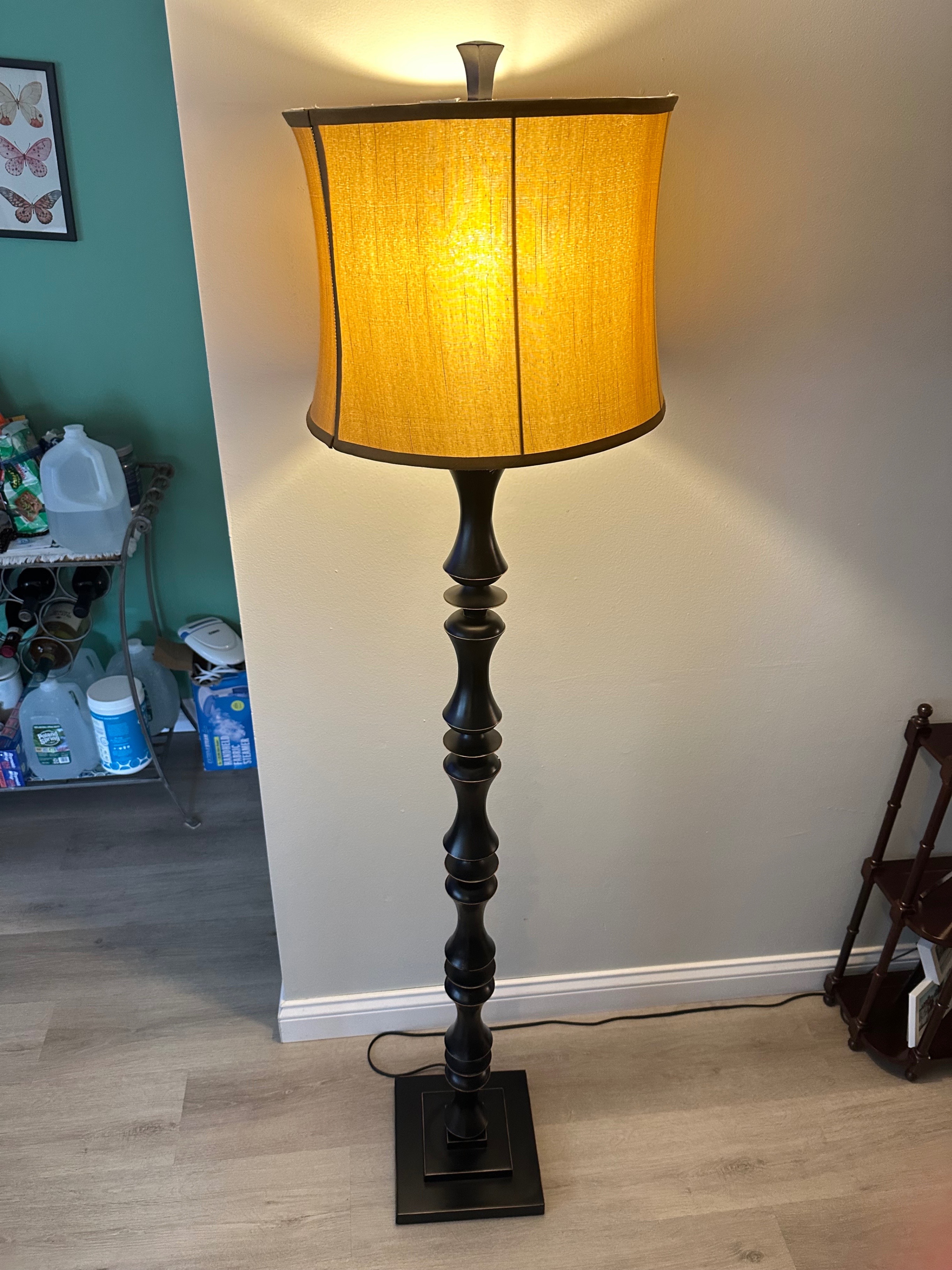 Here's a floor lamp with a brown finish that would look great in any room! It's in good condition and ready to brighten up your space. The lamp has a classic design and provides a warm, ambient light