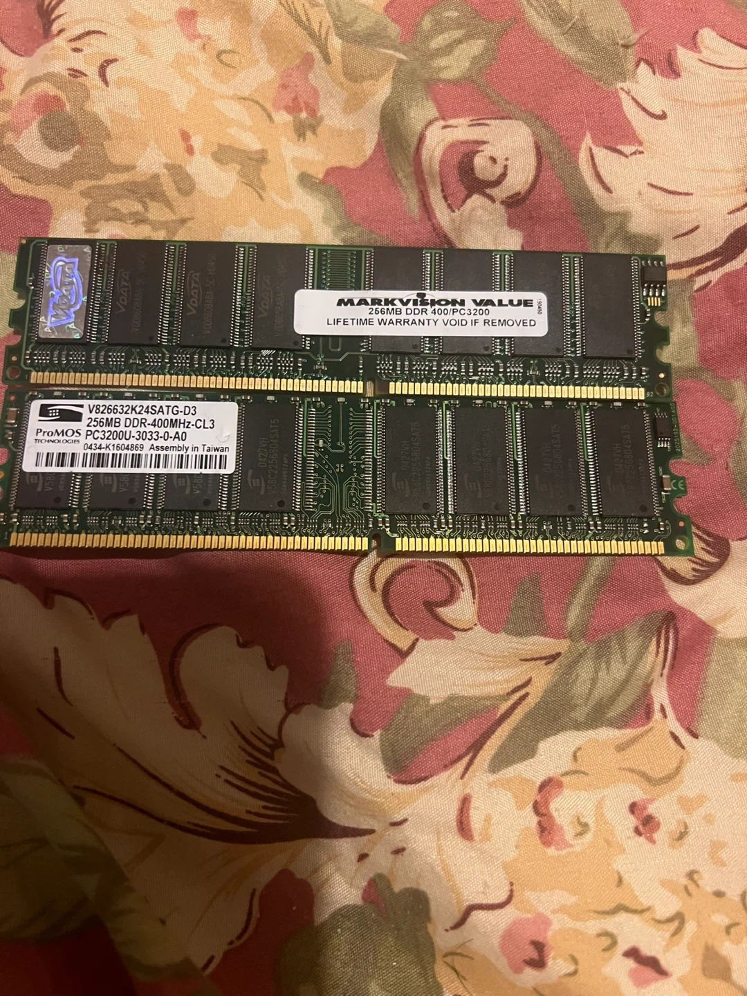 Two 256MB DDR RAM sticks included. One is Markvision Value DDR 400/PC3200, and the other is ProMOS PC3200U-3033-0-A0, also DDR-400MHz-CL3. They're assembled in Taiwan. These sticks are great for upgrading older computer systems!