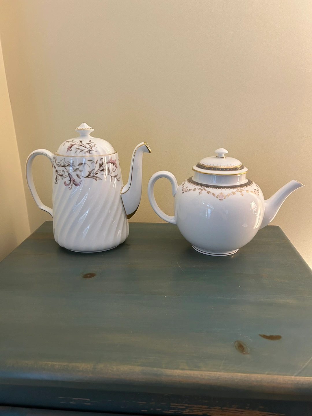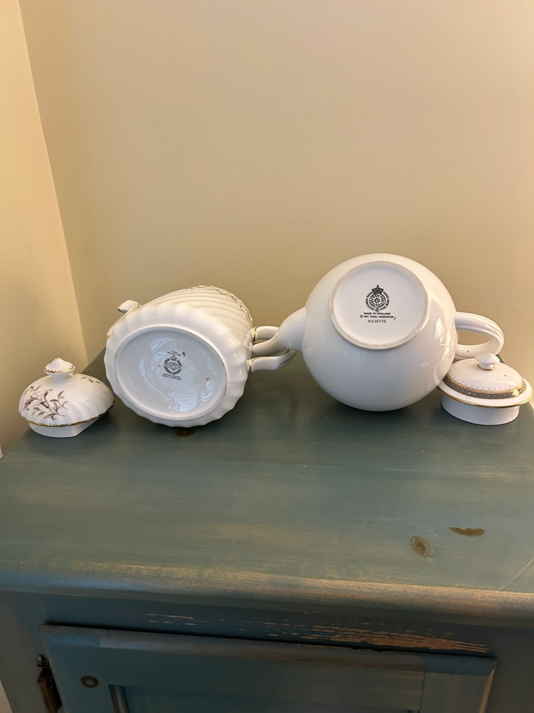 2 Vintage Tea Pots ( Mooreland Minton & Royal Worcester Juliette. Plus 5 Vintage Tea Cups and Saucers. Also included Porcelain Rose Pattern. Creamer ,Sugar Bowl and small pitcher. All items in excellent condition.